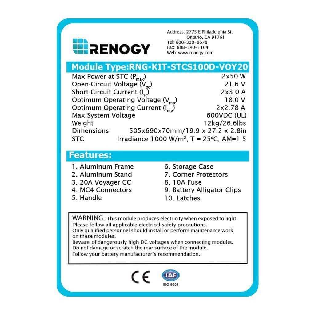Adjustable, corrosion-resistant aluminum stand as well as a heavy duty handle and latches for longevity. Compatible with gel, sealed, lithium, and flooded batteries. Included temperature sensor allows you to monitor with ease. Charge controller with LCD display for displaying operating information and data. 20A built-in 5-stage solar charge controller provides overcharge protection, reducing fire risk. Negative-ground charge controller for compatibility with your RV, boat, trailer, etc. The low-voltage system avoids electric shock hazards. The Renogy 100 Watt 12 Volt Monocrystalline Portable Solar Suitcase is an entire solar power system incorporated into one small package. Weighing in at about 26.60 lbs., this lightweight suitcase includes two 50 Watt Monocrystalline Solar Panels, one 20 Amp waterproof Voyager Charge Controller with an LCD Screen for power regulation, one 10ft tray cable with alligator clips for easy connection to the battery, and a protective casing for safe portability. The Renogy 100 Watt Solar Suitcase will make charging on the go as easy as 1-2-3!