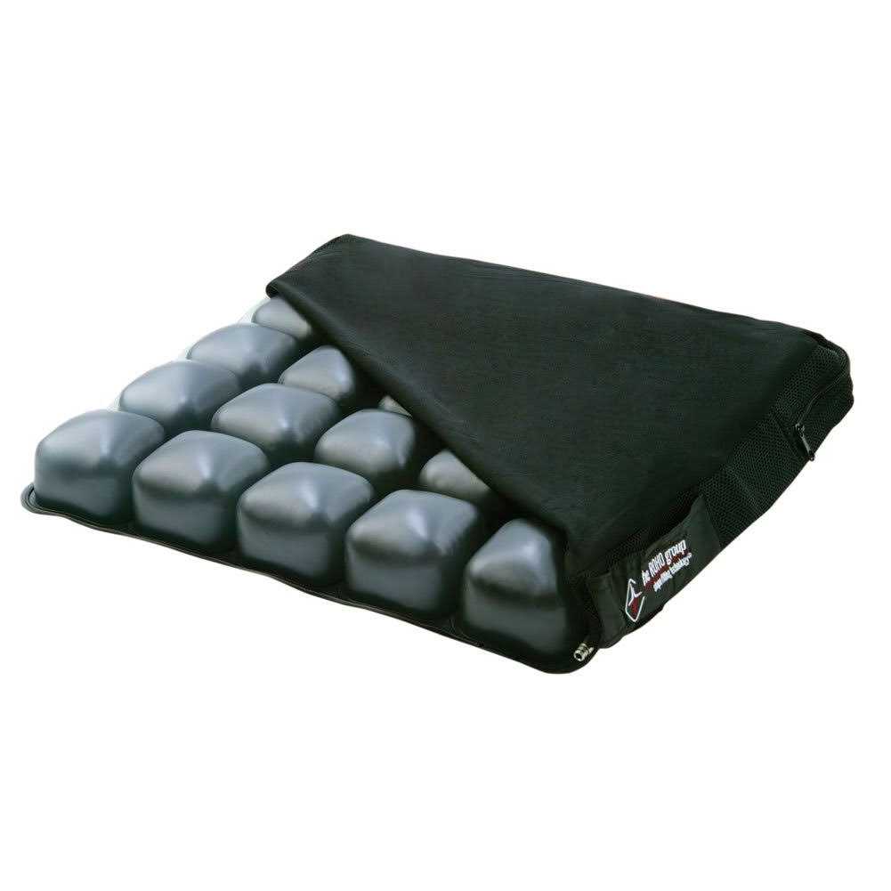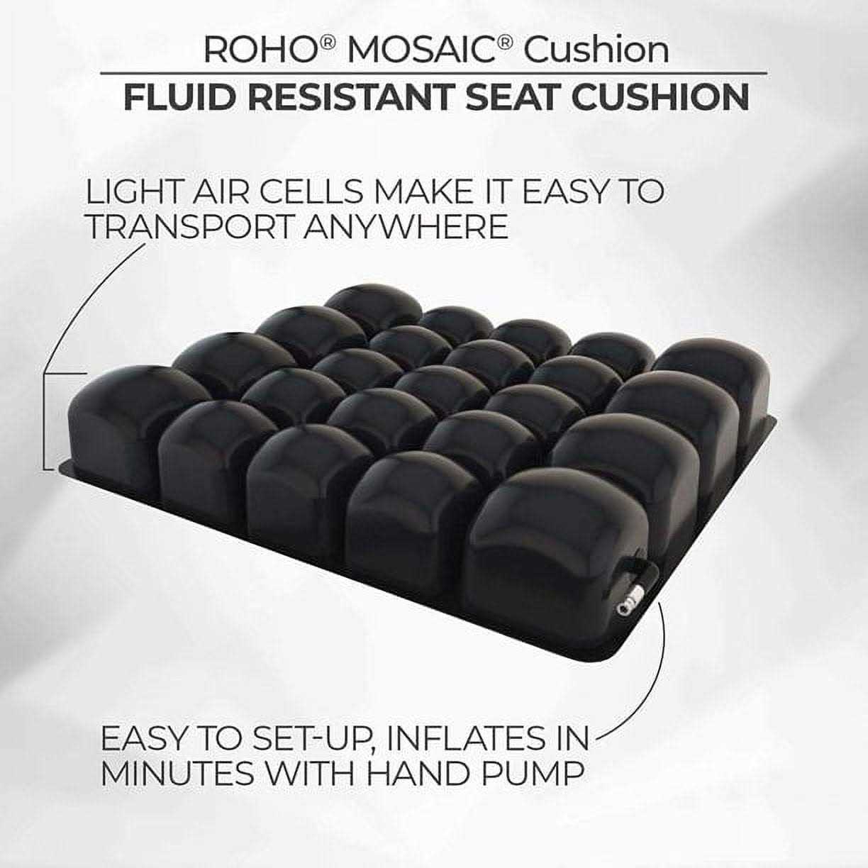 Portable and lightweight cushion holds up to 250 lbs and adds comfort to wheelchairs and hard seats 3″ high poly vinyl interconnected air cells are easy to set up, inflate, and adjust, comes with hand pump and lycra cover with non-skin mesh bottom to ensure pad doesn’t slip off surface Easily inflates by turning the valve on the cushion counter clockwise to open, slide pump rubber nozzle over the valve to inflate and clockwise to close Robust lightweight structure fits most sitting areas and is easy to carry around, ideal for elderly and medical patients who require a softer buffer Lycra cover cushion with non-skin mesh bottom is not waterproof but can be hand washed and air dried ROHO Cushions provide a comfortable, functional, and customizable sitting solution for people who may experience pain while sitting. Each cushion’s air pockets are easy to set up and completely adjustable for maximum comfort. Choose between a lycra cover with a non-skid mesh bottom or a heavy-duty, water resistant cover. All cushions come with a hand pump for easy pumping.
