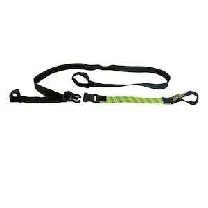- Two-piece strap consisting of a webbing element with loop attachments and an elastic element joined by quick-release buckle
