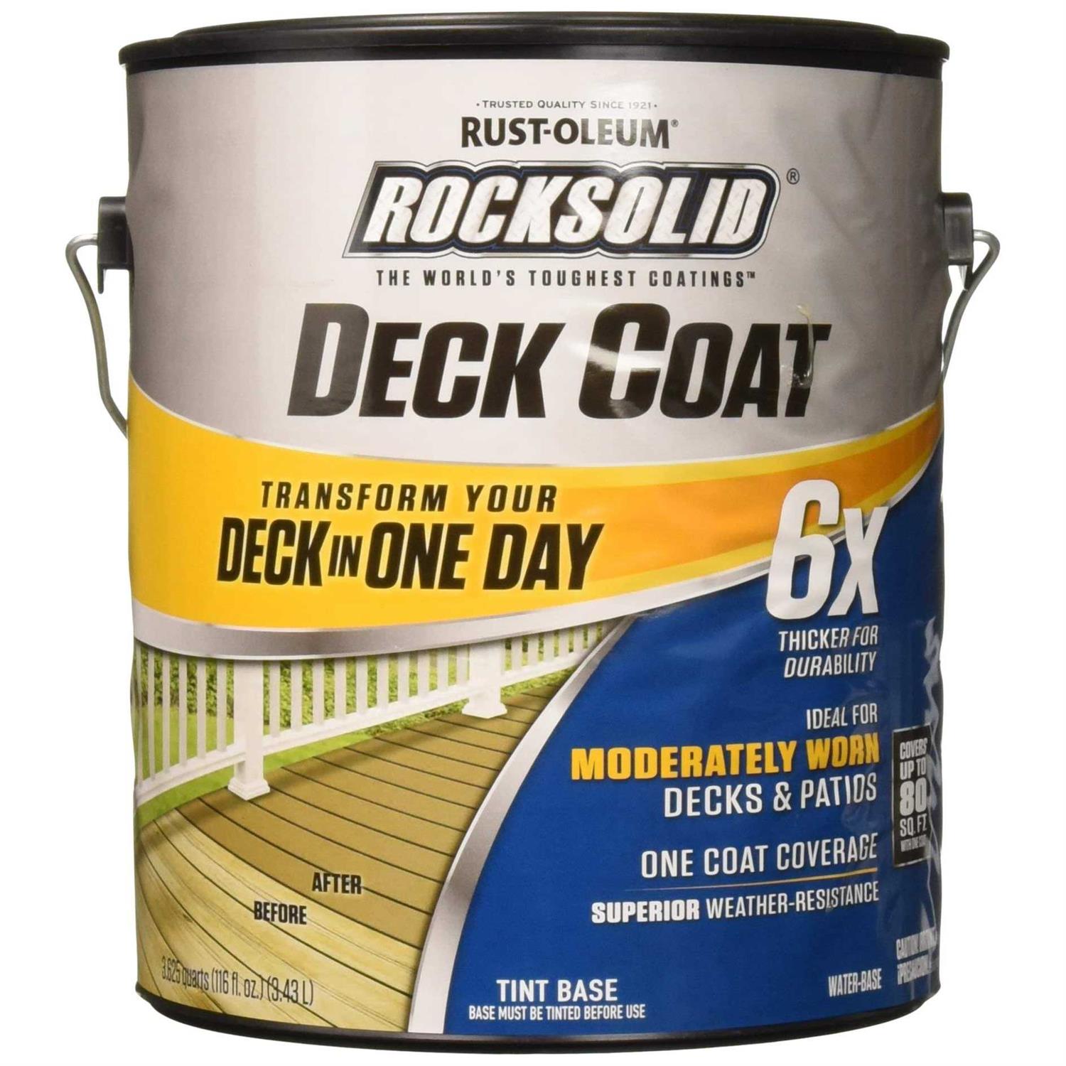 Transform your Deck in One Day with RockSolid 6X Deck Coat. High-build, water-based acrylic coating is specially designed for moderately worn decks and patios. 6X thicker for enhanced durability. Ultra-thick paint allows for 1-coat coverage. Superior weather resistance and waterproofing protection. Fills hairline cracks. For best results, clean using RockSolid Deck & Patio Cleaner and then prime the surface with RockSolid Deck Start Wood Primer.