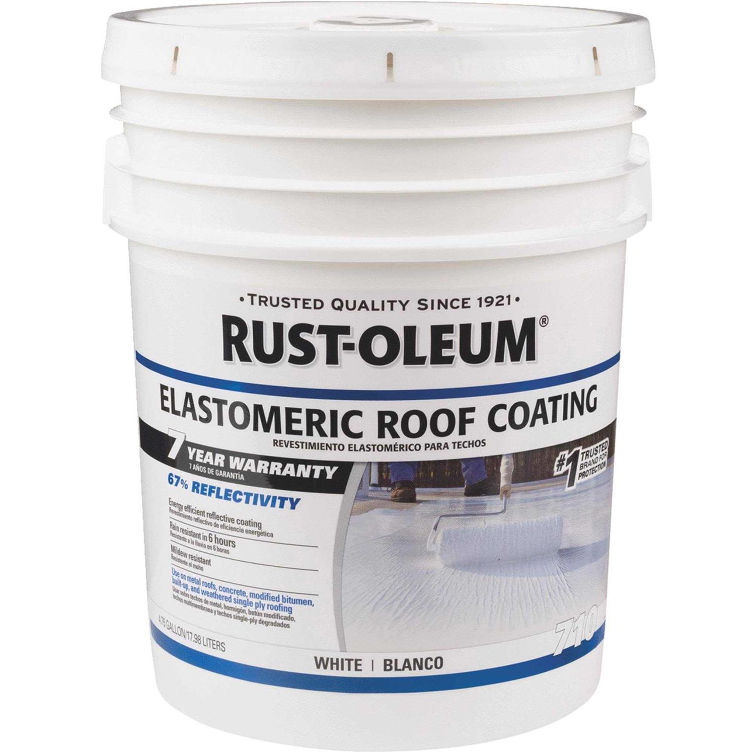 Rust-Oleum 710 Elastomeric Roof Coating provides energy efficient, long-term durability and excellent resistance to weathering and dirt pick-up on metal roofs, concrete, weathered single ply roofing and smooth surface built-up and modified bitumen systems. Long lasting weatherproofing protection and resists cracking down to -10 degrees Fahrenheit. Water-based coating features Cool Roof Technology which offers 80% reflectivity for energy efficiency. 2 coats recommended for durable protection; dries to the touch in 6 hours and recoat after 24 hours. Waterproof seal within 6 hours. Formulated to meet and/or exceed the standards established in ASTM D 6083.