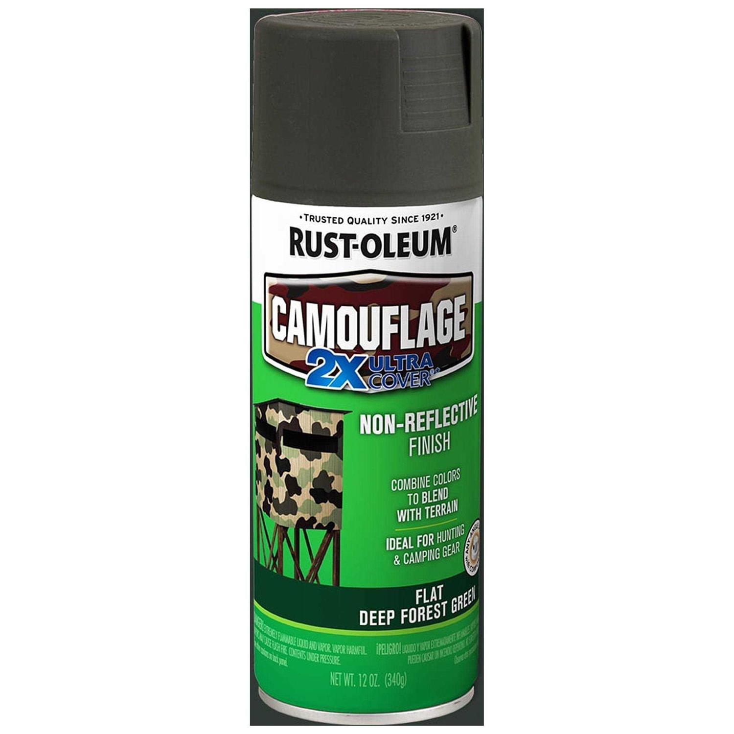 Rust-Oleum Specialty Camouflage Ultra Cover 2X delivers twice the coverage as other competitive brands! The advanced Double Cover Technology provides the best formula for ultimate hiding power, which allows projects to be completed faster and easier. Use for a non-reflective, ultra-flat finish. The paint dries to the touch in just 20 minutes! Ideal for outdoor and indoor use offers long-lasting protection when applied on top of primer.