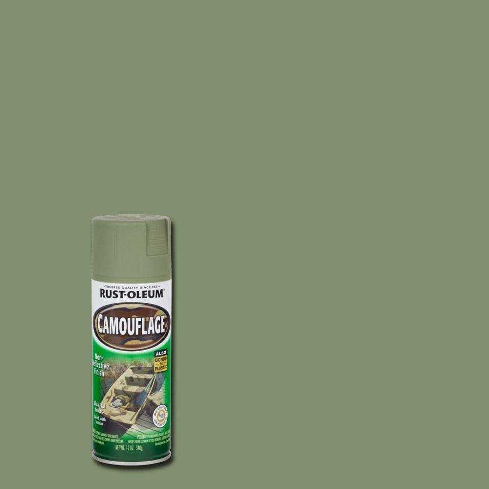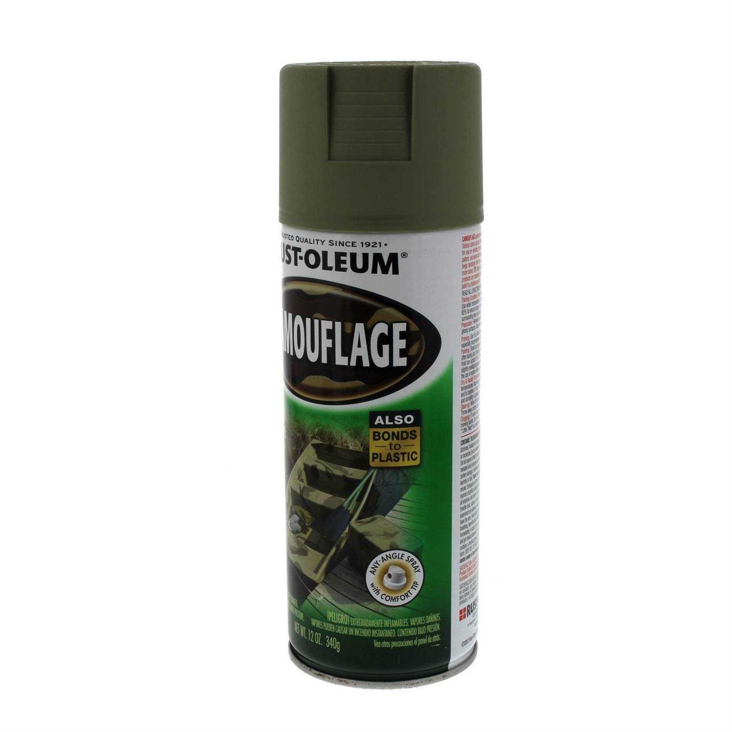 Rust-Oleum Specialty Camouflage Spray provides a non-reflective ultra-flat finish on hunting sporting and other equipment for maximum hide in outdoor terrain. Ideal for use on exterior surfaces such as metal wood plaster or masonry to disguise objects and blend them into surroundings. Formulated to resist chipping cracking and peeling on a variety of outdoor objects including vehicles tree stands decoys blinds boats and equipment. Covers up to 7 sq ft and dries to the touch in 20 minutes for quick project completion. Ultra flat finish will not reflect sunlight allowing items to remain undetected. Offers any-angle spray technology along with a comfort spray tip to reduce finger fatigue. Create a unique and natural looking pattern with a variety of camouflage spray colors and stencils like leaves and twigs.