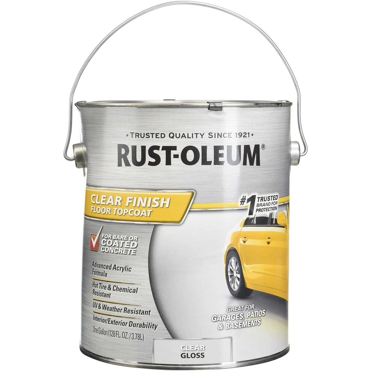 Rust-Oleum Clear Finish Floor Topcoat is a ready-to-use interior/exterior concrete protective coating formulated for use on garages, carports, driveways, basements, porches, patios, walkways, pool decks, and high traffic areas. Use over bare concrete or over 1-part floor paints to add a protective, gloss finish that resists damage from hot tires, motor oil, grease, and gasoline. UV and weather resistant gloss finish is easy to maintain and resists fading and peeling. Coverage area: 150 to 250 Sq. Ft. over bare concrete and 300 to 400 Sq. Ft. over coated concrete. Surface should be ready for light foot traffic in 24 hours. For full cure and vehicle traffic, allow 5 days. Dry times increase at cooler temperatures. Only 1 coat is necessary, if a second coat is desired wait 4 hours before applying in a direction perpendicular to the first. Environmentally friendly.