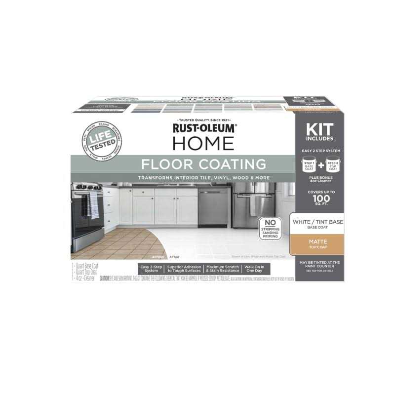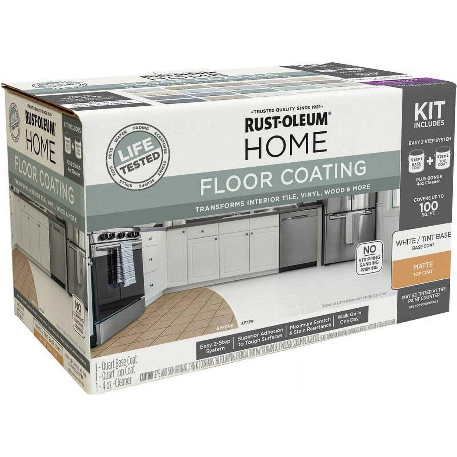 RUST-OLEUM HOME Interior Floor Coating System provides revolutionary technology in an extremely durable coating for a variety of indoor floors. 2-Step Paint Floor System consists of a separate Base Coat and Top Coat to update the look of any room with Life Tested durability against fading scratches stains spills and messes. Easy to use transformation requires no stripping sanding or priming. Use to paint tile wood floors vinyl laminate concrete bare concrete and more. Remodel nearly any interior floor in one day with no messy demo using a floor paint designed for foot traffic featuring maximum scratch and stain resistance.