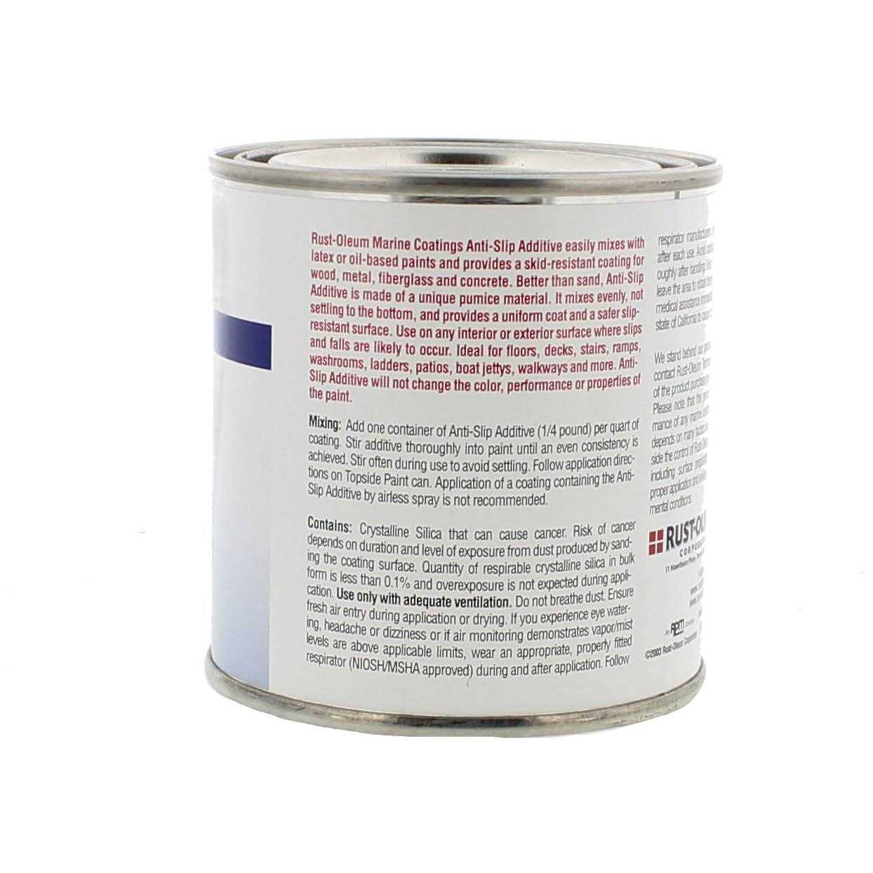 Paint Additives by Rust-Oleum. Details: Rust-Oleum Marine Anti-Slip Additive provides a skid-resistant finish when mixed with oil or latex-based paints. It is great for creating anti-slip, safe surfaces on indoor/outdoor floors, decks, stairs, ramps, ladders and more. For proper application, mix thoroughly into the paint until an even and consistent mixture is achieved and stir often to avoid settling. Rust-Oleum Marine Anti-Slip provides a skid-resistant finish when mixed with oil or latex-based paints. Ideal for use on floors, decks, stairs, ramps, docks, ladders and more.