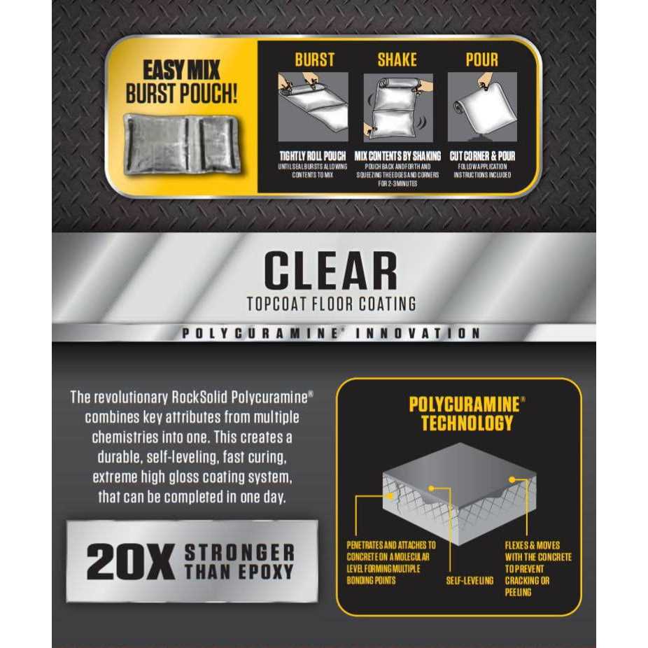 Rock-solid Floors Polycuramine Clear Top Coat is a clear high gloss protective coating that is formulated to offer unsurpassed durability. It is 20 times more durable than epoxy, ensuring that it won’t crack or peel and providing resistance to salt, oil, gas and other harsh chemicals. Walk on in 8-10 hours and drive on in 24 hours. Impervious to chemicals, industrial grade floor coating. 70 full ounce Kit.