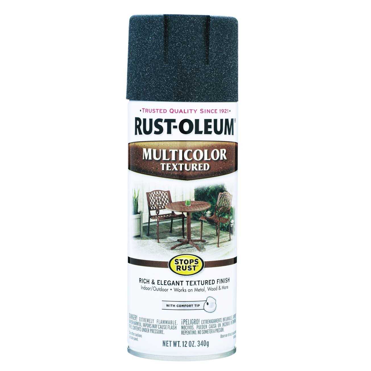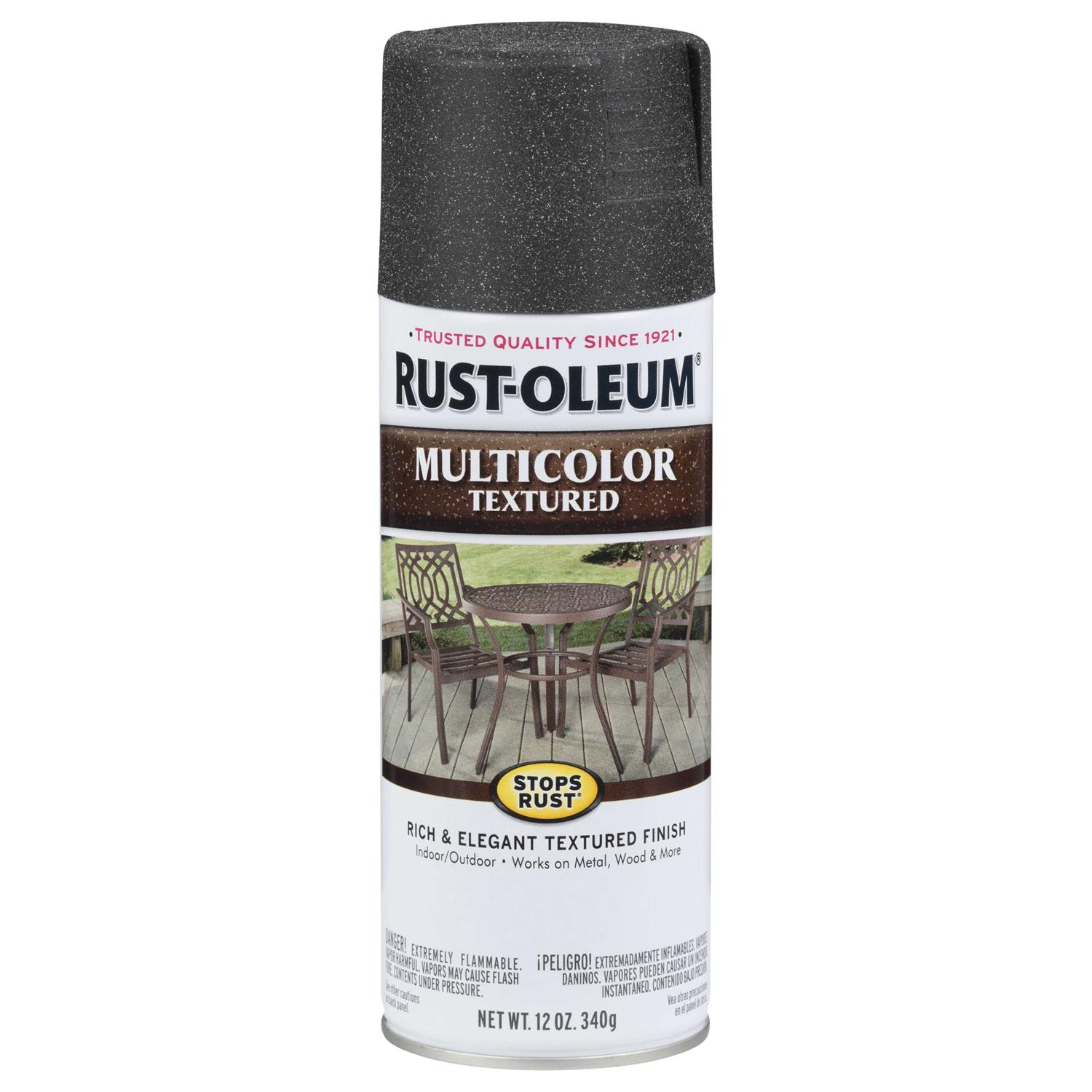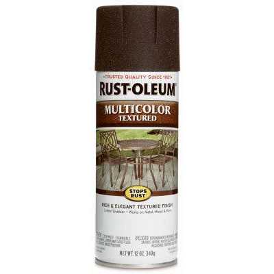 Rust-Oleum Stops Rust MultiColor Textured Spray Paint adds color and dimension to your project. Choose among shades of brown and green for the color combination that will bring your vision to life. Use MultiColor Textured Spray Paint on patio tables, chairs, light fixtures and more. Can be used on indoor and outdoor surfaces Resists rust and corrosion with its Stops Rust formula Is durable enough to withstand everyday use Comes in a variety of colors Apply two or more light coats a few minutes apart. Apply a second coat or clear coat within 1 hour or after 48 hours Coverage: 4-8 sq. ft./can Use of a Stops Rust Primer provides added corrosion protection, superior adhesion and hiding and is especially recommended for bare wood and metal. These sprays feature a comfort tip with a wider finger pad to reduce fatigue caused by continuous spraying. Rust-Oleum Stops Rust Textured Sprays are designed to provide a durable protective coating with excellent resistance to rust, and excellent resistance to abrasion, fading, chipping, and dulling. These sprays apply easily, provide excellent coverage and dry fast to a tough attractive finish. Rust-Oleum Stops Rust Textured Sprays are ideal for outdoor metal surfaces. These sprays feature a comfort tip with a wider finger pad to reduce fatigue caused by continuous spraying. Not for use on galvanized metal.