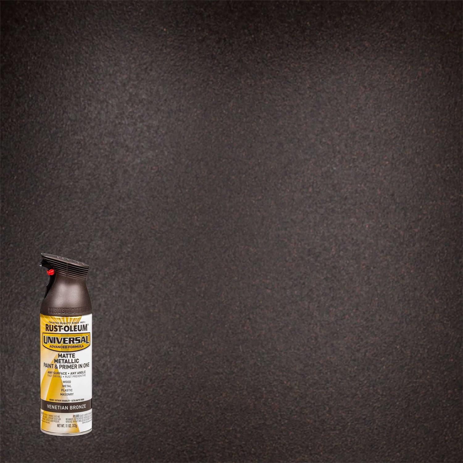 Venetian Bronze, Rust-Oleum Universal All Surface Interior/Exterior Matte Metallic Spray Paint, 11 oz : Can be used on virtually any surface: vinyl, metal, plastic, fiberglass, concrete, glass, wicker and wood. Oil based formula provides superior coverage up to 15 sq. ft., durability and protection from rust. Paint dries to the touch in 30 minutes. Specially designed nozzle eliminates finger fatigue, protects against dripping and sprays from any angle – even upside down for hard to reach areas.