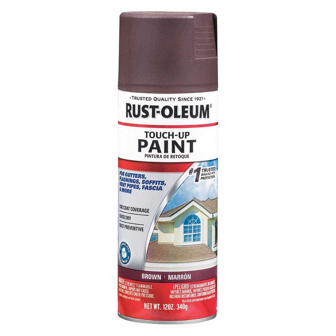 The Rust-Oleum Roofing Touch Up Paint Spray creates a durable and rust-preventative finish when touching up gutters, soffits, vent pipes, and other roofing materials. For best results on exterior applications when the temperature is between 50 and 90 degrees Fahrenheit and the humidity is below 65% to ensure the proper drying. This touch up spray paint from Rust-Oleum dries to the touch in 20 minutes, is able to be to handled in 1 hour and is fully dry in 24 hours.