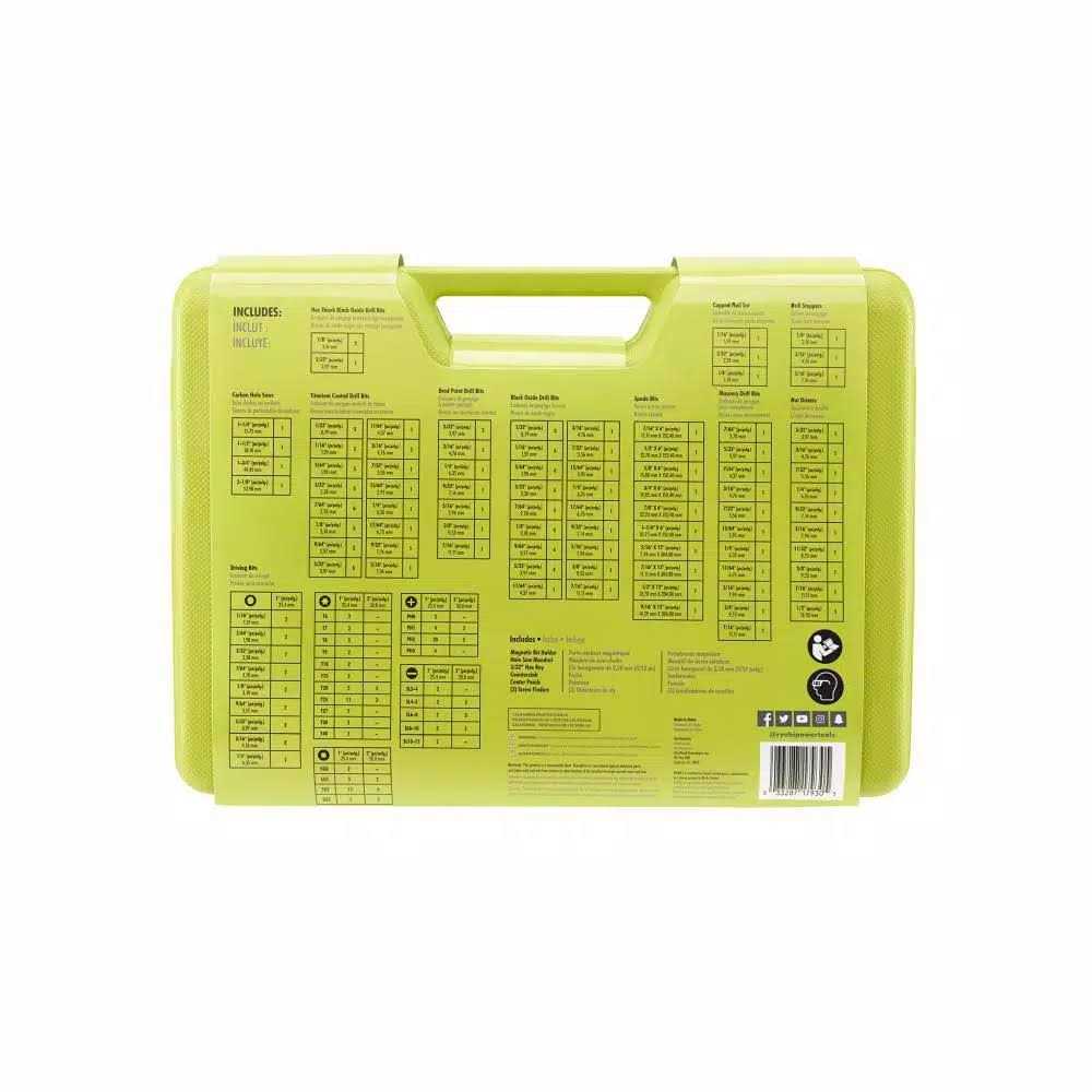 Ryobi introduces the 300 Piece Drill and Drive Kit with Case. This multi-material kit features black-oxide drill bits titanium drill bits carbon hole saws nut drivers 1 in. and 2 in. driving bits and much more. It s perfect for drilling into wood metal and plastic” and the included driving bits work on wide variety of fasteners. Additionally this ultimate kit comes equipped with a durable carrying case making it easy to transport and store. The Multi-Material Drill and Drive Kit includes 300 drill and drive bits and a durable carrying case. Includes hex shank black oxide drill bits in 1/8 in. and 5/32 in. Includes drill stoppers in 1/8 in. 3/16 in. and 5/16 in. Includes carbon hole saw ranging from 1-1/4 in. through 2-1/8 in. Driving bits in sizes ranging from 1/16 in. to 1/4 in.