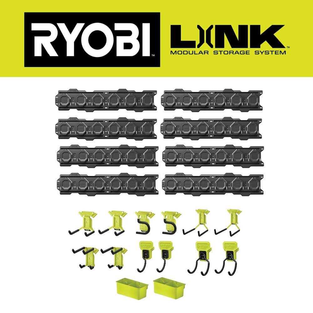 The RYOBI LINK Modular Storage System is revolutionizing the storage industry, enabling you to Organize, Access and Transport your life. The RYOBI LINK 24 PC. Wall Storage Kit allows you to optimize your space with customizable organization. The eight 33 in. Wall Rails are easily installed with visible mounting points and provide maximum stud engagement to hold 75 lb. per foot weight capacity. This kit provides you with the foundation to organize your life and easily expand with a full range of storage solutions. Best of all, it is part of the RYOBI LINK Modular Storage System line of products that use the same locking technology to seamlessly connect your mobile and stationary storage needs. Own your space with RYOBI LINK Modular Storage System.