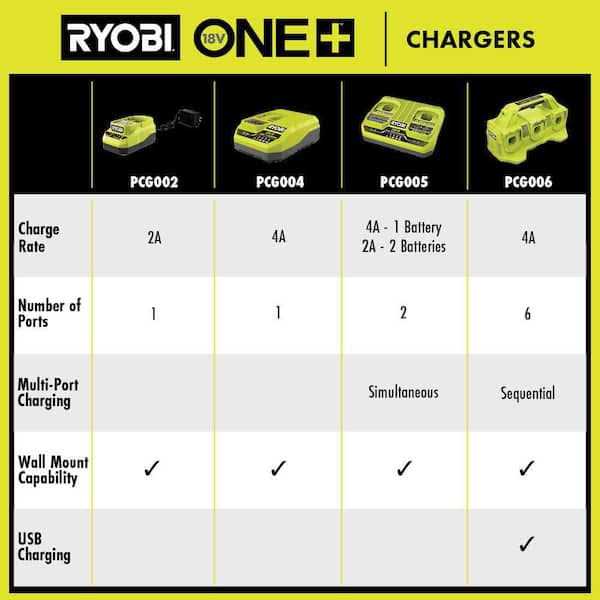 It is part of the 18V ONE+ tool collection and works with any RYOBI 18V ONE+ Lithium-Ion battery. Best of all, it is part of the RYOBI ONE+ system, any ONE+ battery fits any ONE+ tool. For large scale projects, this Lithium 6-Port Dual Chemistry Charger ensures that you’ll have an arsenal of batteries ready and charged for your benefit.