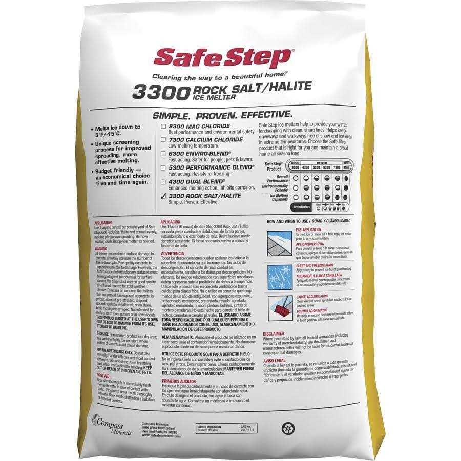 Safe Step 3300 Ice Melter melts ice and snow in weather down to 5 degrees Fahrenheit (negative 15 degrees Celsius). It is made of 100 percent rock salt and with a unique screening process for optimum-sized crystal for improved melting performance. It is fast, reliable and proven effective in clearing the way of ice and snow. Cost-effective ice melter is safe for people, pets and the environment.