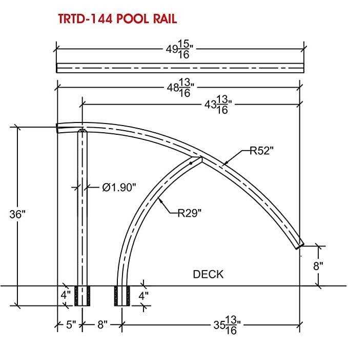 Saftron’s Triton Series pool rails are ideal for salt chlorinated pools. Fully reinforced construction provides superior strength and durability. The TRTD-144 has a width of 44″, height of 36″, a top rail length of 48″ and includes escutcheons.