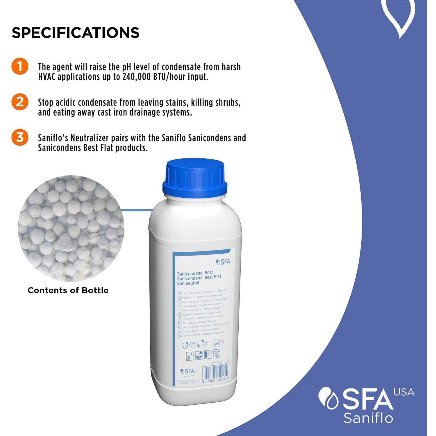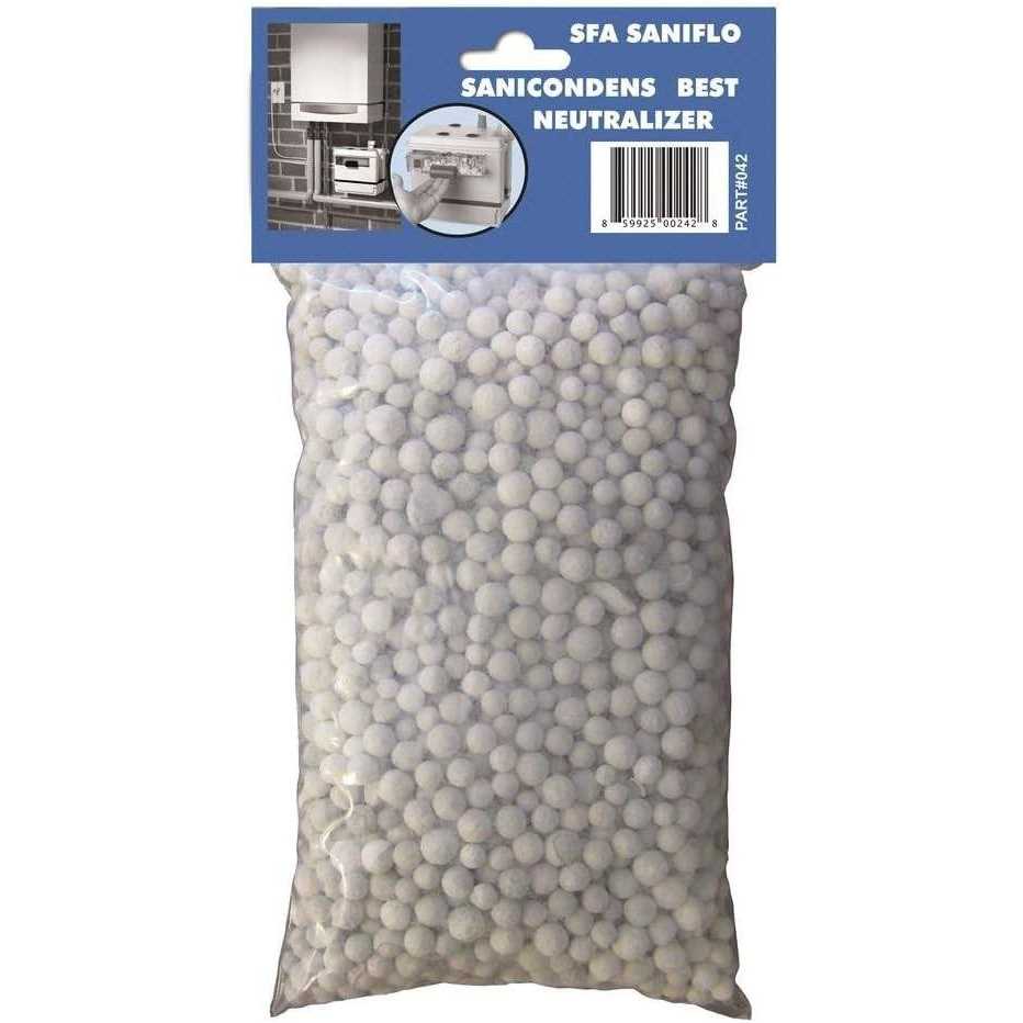 Saniflo 042 Sanicondens Best Flat Neutralizer Saniflo’s neutralizing agent (Part# 042) is used to raise the pH level from condensate being produced by condensing boilers, air conditioners, etc. The neutralizing granules are to be used with Sanicondens Best system. Neutralized condensate prevents the corroding of drains and sewer systems while being more environmentally friendly. The neutralizing agent automatically increases the pH of the acidic condensation bringing it to local code levels while minimizing the corrosive effects.