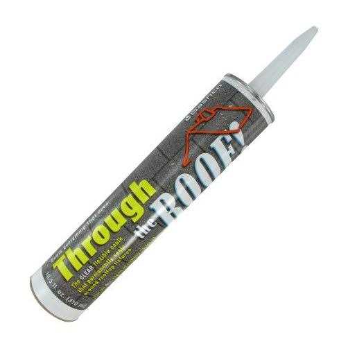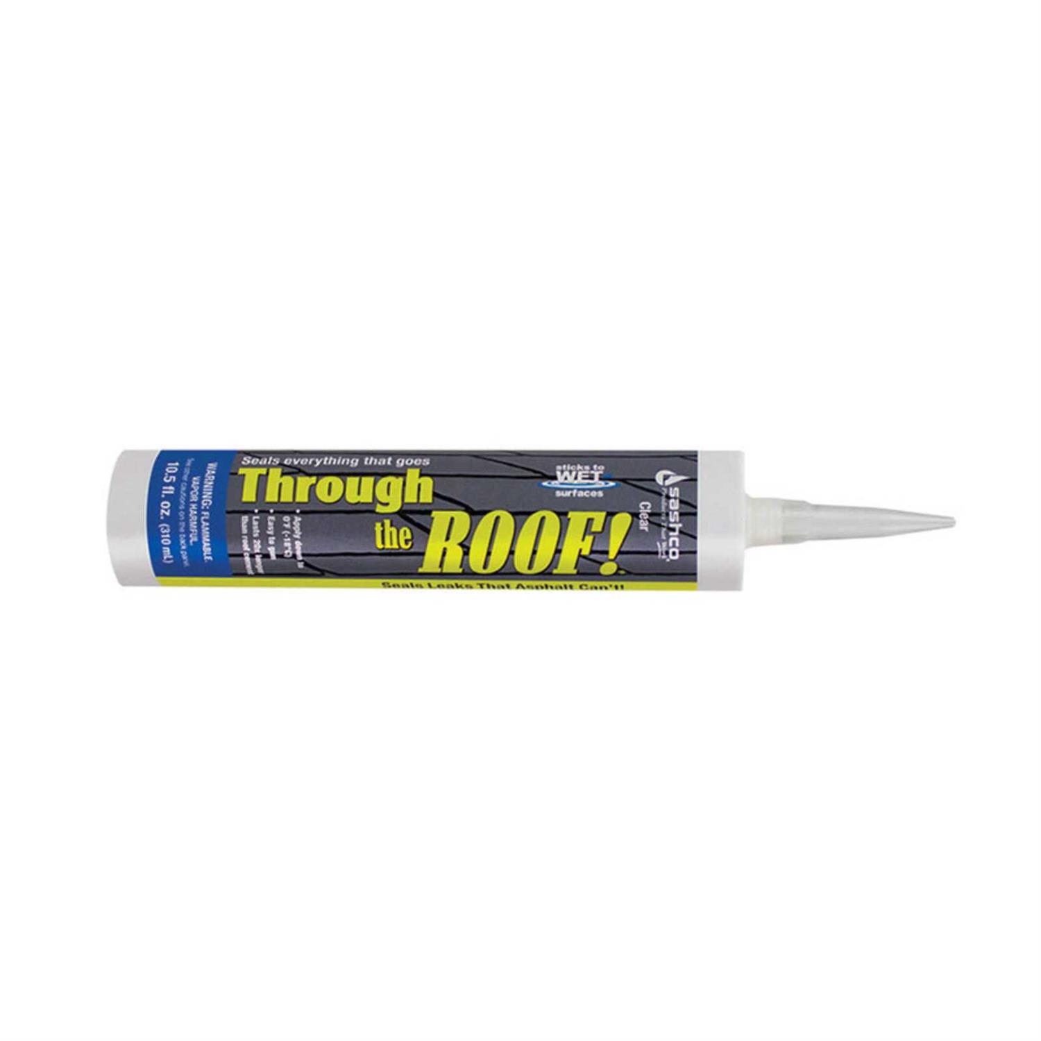 Seals anything that goes through the roof Clear sealant Excellent adhesion to rooftop materials Elastic and waterproof Will not become brittle in cold or sun Paintable 10.5 oz Through the Roof! is the clear, ultra-elastic sealant made to permanently stop and prevent roof leaks. It effectively seals around a variety of roof fixtures without the messy look of asphalt. won’t dry hard and crack like traditional asphalt repair products, and lasts 20 times longer! It expands and contracts with temperature changes, leaving you with a repair that sticks but won’t stick out. Conforms to ASTM C794.