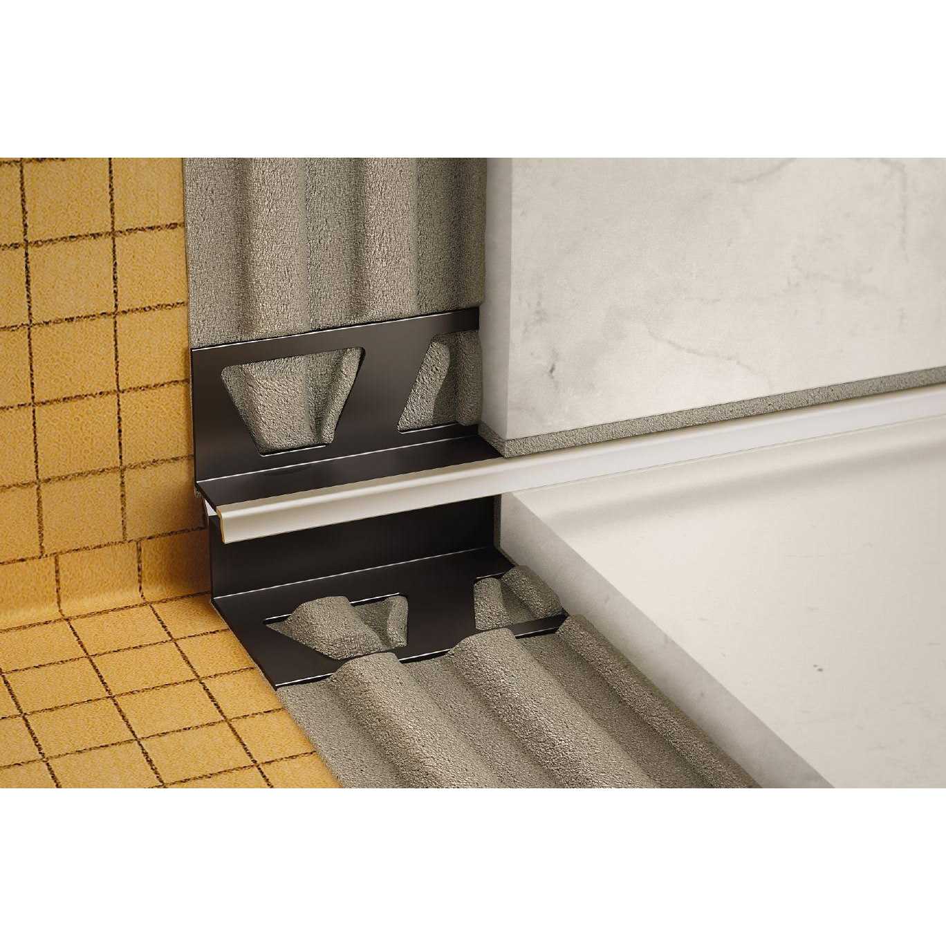 The Dilex-EKE is a corner movement joint profile with rigid PVC anchoring legs. Features a 3/16-in wide, soft CPE movement zone that separates individual tile fields at floor, wall and inside wall corners, and forms the visible surface. Prevents tile edges from chipping. Movement zone is available in different colors to match grout and forms a discreet, uniform joint. Prevents surface-water penetration and sound bridges, making it ideal for floor/wall transitions in sound-rated floors. Movement zone featured in black. For floor/wall transitions, accommodates tiles that are 5/16-in thick; profile is 8-ft long. For inside wall corners, accommodates tiles that are 9/32-in thick; profile is 8-ft long.