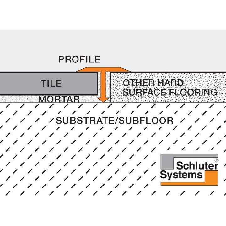 Schluter-RENO-T profiles are designed specifically to provide a clean, elegant transition between existing same-height hard surface floor coverings. Effortless transitions can be made in both new and retrofit applications with flooring as common as laminate or as exotic as marble. The solid brass profile is engineered with durability and longevity in mind, protecting floors regardless of age, while the brilliant solid brass finish of the T 9/14 AE adds a touch of sophistication to any home. Product Features Wide Top Surface Schluter-RENO-T profiles are designed with a wide top surface. This top platform not only provides a graceful transition between different hard surface floorings, but also protects the edges of each from mechanical stress. Pure Aluminum Construction This profile is constructed from aluminum, giving it the durability it needs to last for many years without the worry of breakage or bending.