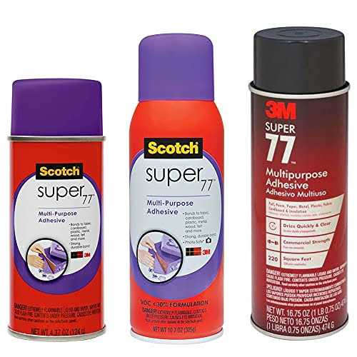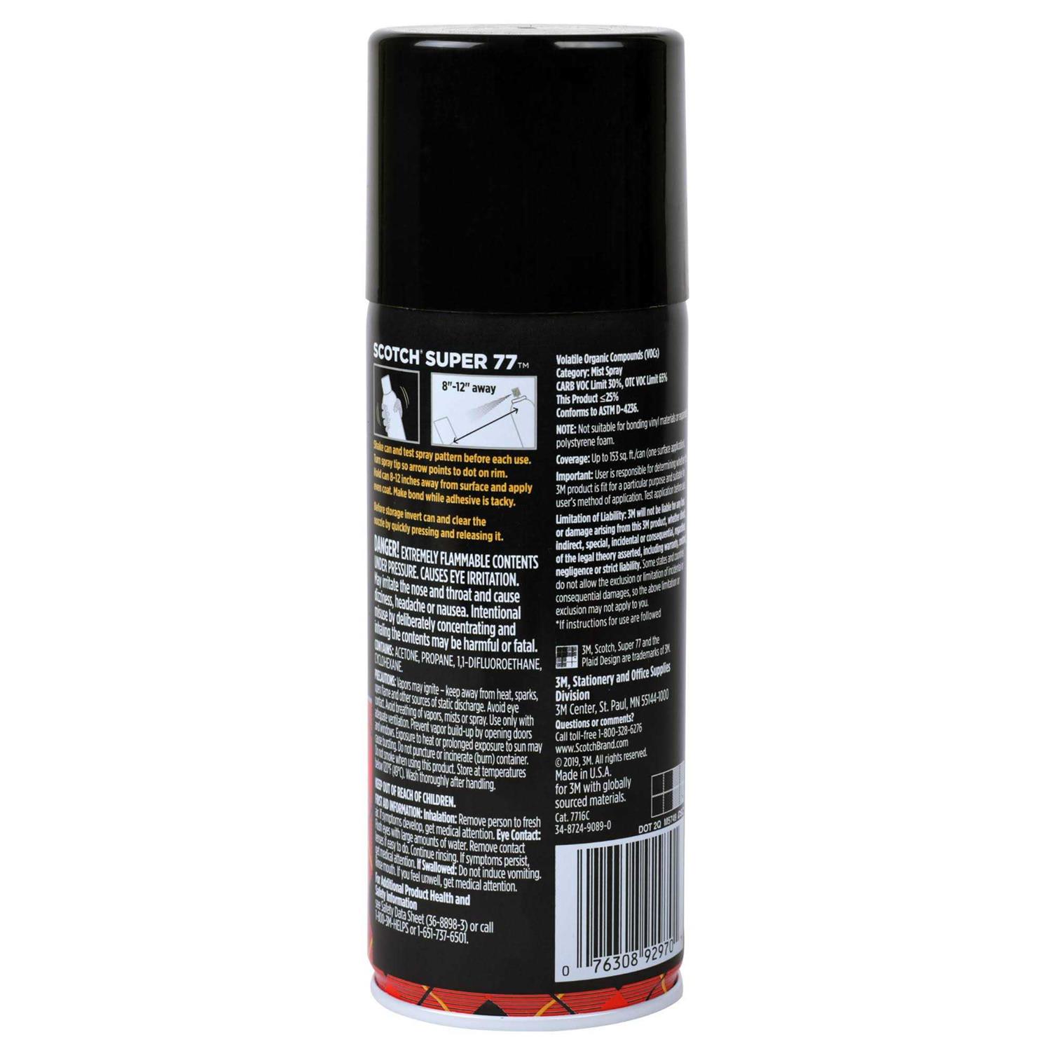 Scotch Super 77 Multi-Purpose Spray Adhesive: 10.7 ounce container (Clear) – Scotch Super 77 Multi-Purpose Spray Adhesive is a versatile spray adhesive that provides a powerful, quick-to-dry bond in a convenient spray can applicator. This adhesive bonds well to fabric, cardboard, plastic, metal, wood, felt, and many more surfaces, making it ideal for projects ranging from minor repairs around the home to crafting projects. The acid-free formula is safe for use with photos and other delicate paper products. Available in 4.37-ounce or 10.7-ounce cans with spray applicator tops. A brand of 3M. Made in the U.S.