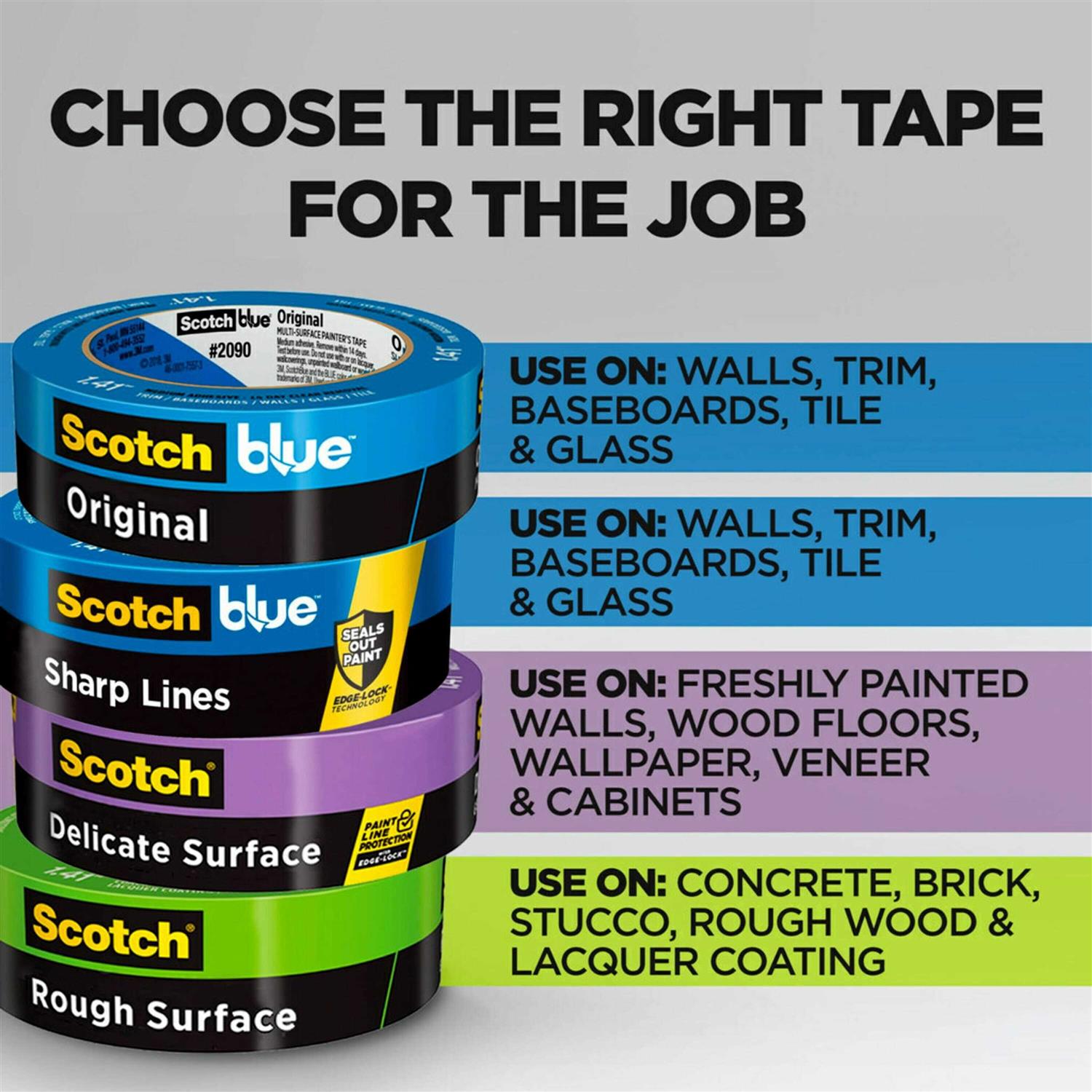 ScotchBlue Original Multi-Surface Painters Tape offers a versatile solution for protecting your surfaces so you can bring your creative visions to life. Designed for smooth or lightly textured walls, trim, baseboards, tile and glass, this adhesive tape can stay on for up to 14 days and removes easily without leaving behind a sticky residue. Resistant to UV rays, sunlight and moisture, ScotchBlue Painters Tape is an ideal indoor and outdoor tape, letting you conquer wow-worthy painting projects on multiple surfaces. Made from 45% renewable resources with a core made from 70% post-consumer waste, this solvent-free masking tape is made in a zero-landfill site certified for energy management to provide you with a sustainable painting product. The application is simple. Make sure the surface is clean, dry and dust-free so your blue painter tape sticks properly. Apply the tape onto the surface while pressing down firmly. Let the painting tape set for about 30 to 60 minutes before painting. Removal is just as easy. Wait until the paint is dry to the touch before removing the used paint tape. Lift the blue tape up by slowly pulling it back on itself, then remove it at a 45-degree angle. The best paint jobs start with Scotch Painters Tape. With a full range of adhesive solutions, ScotchBlue Painters Tape delivers confidence in superior results to get the job done right and effectively the first time. By choosing to use the right tape, youre choosing to create a better result. From the brand that is No. 1 trusted by professional painters (1), ScotchBlue Brand offers a full line of tapes specifically designed for the various demands of the project/job. (1) ScotchBlue and Scotch brands are ranked as the most trusted based on a 2020 Kantar US Brand Health Survey.
