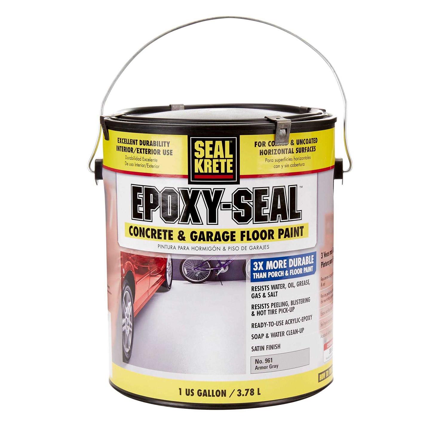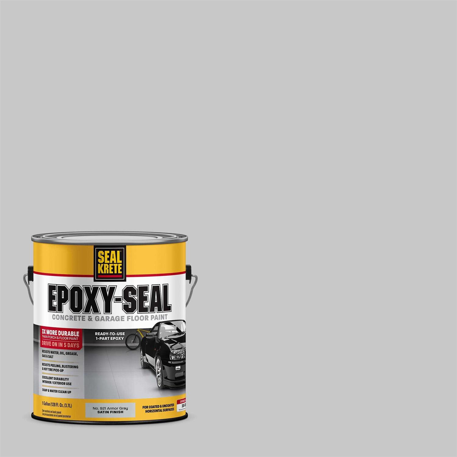SEAL-KRETE Epoxy-Seal Concrete and Garage Floor Paint is a ready-to-use, acrylic-epoxy blend formulated to resist hot tire pick-up, water, oil, grease and gasoline stains. This epoxy-fortified formula dries to a durable, UV-resistant, satin finish that resists scuffing, peeling, blistering and fading.