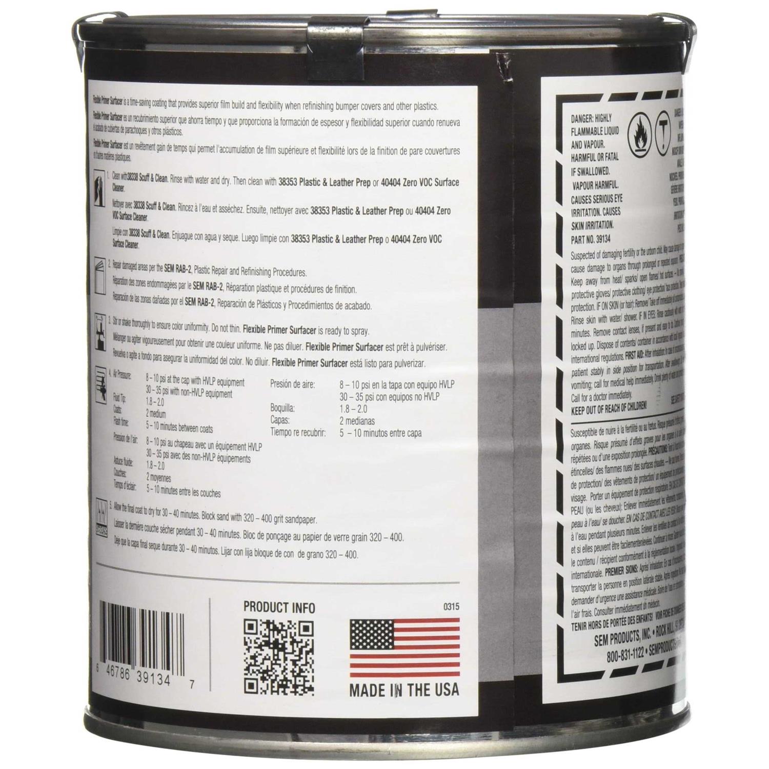 SEM Products Inc SEM-39134: Paint, Flexible Primer Surfacer, Flat Gray, Aerosol, 1 qt., Each – Prepare your urethane and plastic projects with SEM Products flexible primer surfacers. A smooth surface makes for a better finish and these surfacers have a higher solids formulation for faster build. SEM flexible primer surfacers are ready to spray and offer quick drying and easy sanding. Before you paint, you prime; make the right choice to gain the perfect surface for painting with SEM Products flexible primer surfacers.