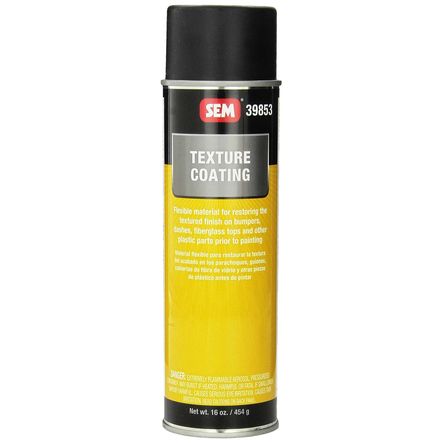 SEM Textured Coating, Black (39853) is a unique blend of flexible materials for restoring the textured finish on bumpers, dashes, fiberglass tops and other plastic parts prior to painting. Duplicates original textures. Ready to spray and quick drying. Topcoat over with most refinishing materials.