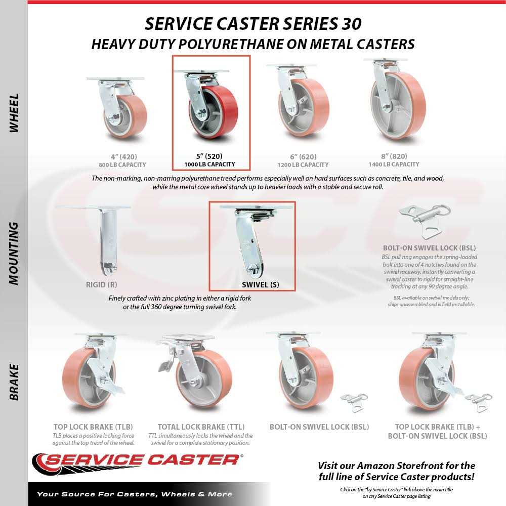 Listing is for one (1) Service Caster Series #30 swivel caster with a 5 inch diameter, 2 inch wide red polyurethane tread set on a metal core wheel. Supports 1000 pounds (lbs) per caster. Non Marking/Non Marring.When searching for a reliable and durable solution for medium and heavy duty projects, consider Service Casters Series 30 top plate polyurethane casters. The non-marking, non-marring polyurethane tread performs especially well on hard surfaces such as concrete, tile, and wood, while the metal core wheel stands up to heavier loads with a stable and secure roll. Finely crafted with double ball bearing heat treated raceways, these versatile casters are ideal for a wide range of applications, such as dollies, platform trucks, warehouse carts and freight terminals. Or ensure a smooth and secure ride for food service carts, hotel housekeeping carts, and industrial and commercial equipment. Even drywall carts, welding carts, and wall panel carts will be ready to roll on the Series 30, keeping you moving forward.