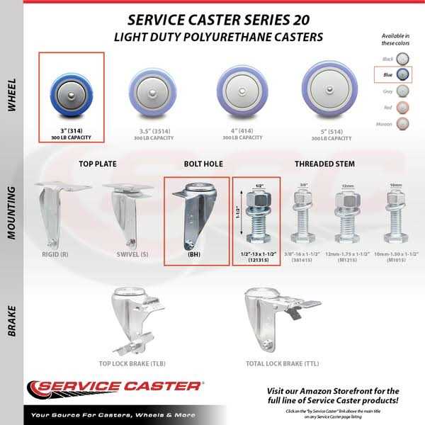 Listing is for one (1) Service Caster Series #20 swivel caster with a 3 inch diameter by 1-1/4 inch wide blue polyurethane wheel and a 1/2 inch threaded stem capable of supporting 250 lbs./caster.When searching for a reliable and durable solution to your caster needs, consider Service Casters Series 20 threaded stem polyurethane casters. The bolt hole can accept a bolt or a customized stem, allowing for any type of mounting requirement. The zinc plated finish provides durability under any condition, while the non-marking, non-marring polyurethane wheels perform especially well on hard surfaces such as concrete, tile, and wood. All rolling on a finely crafted ball bearing design that will keep you moving forward.