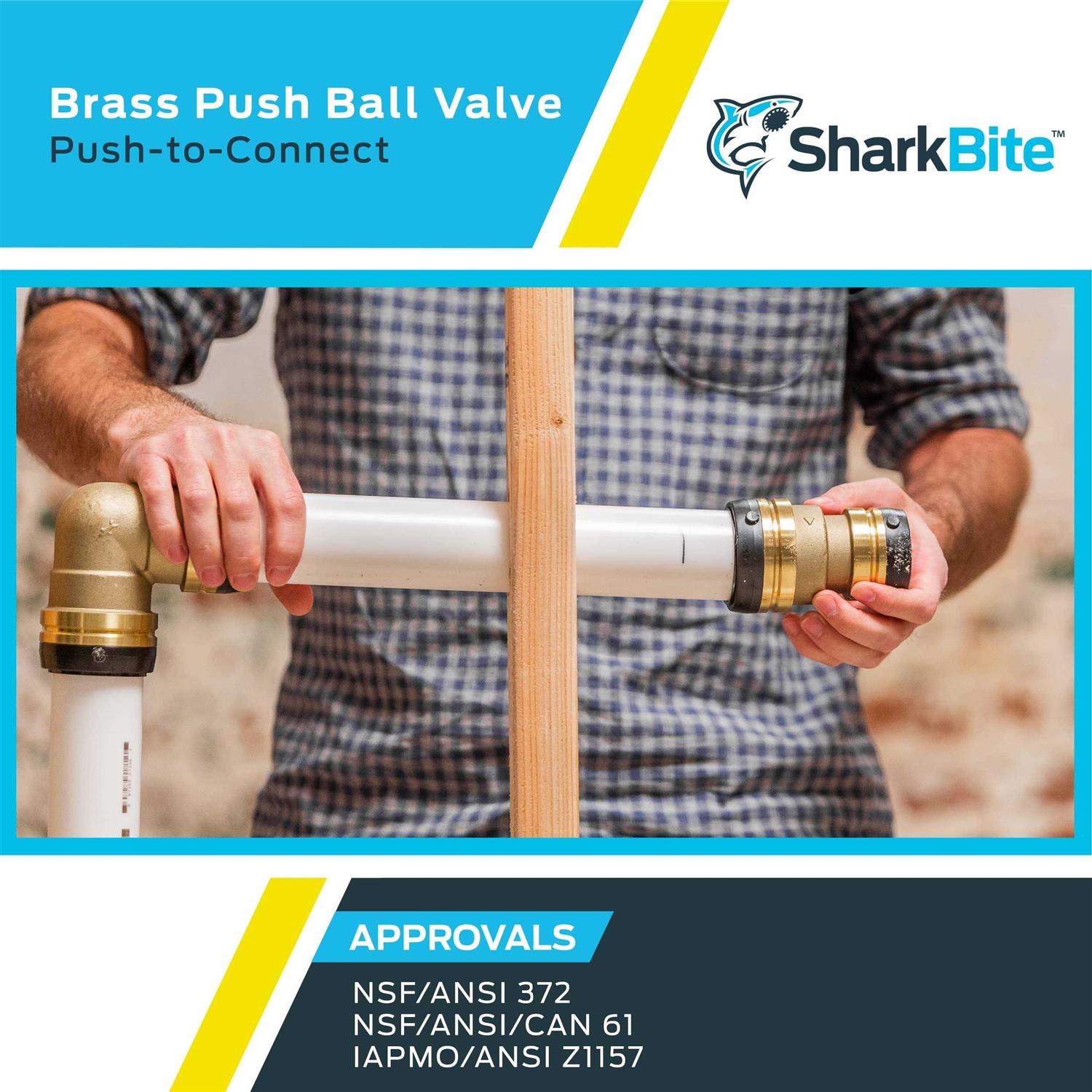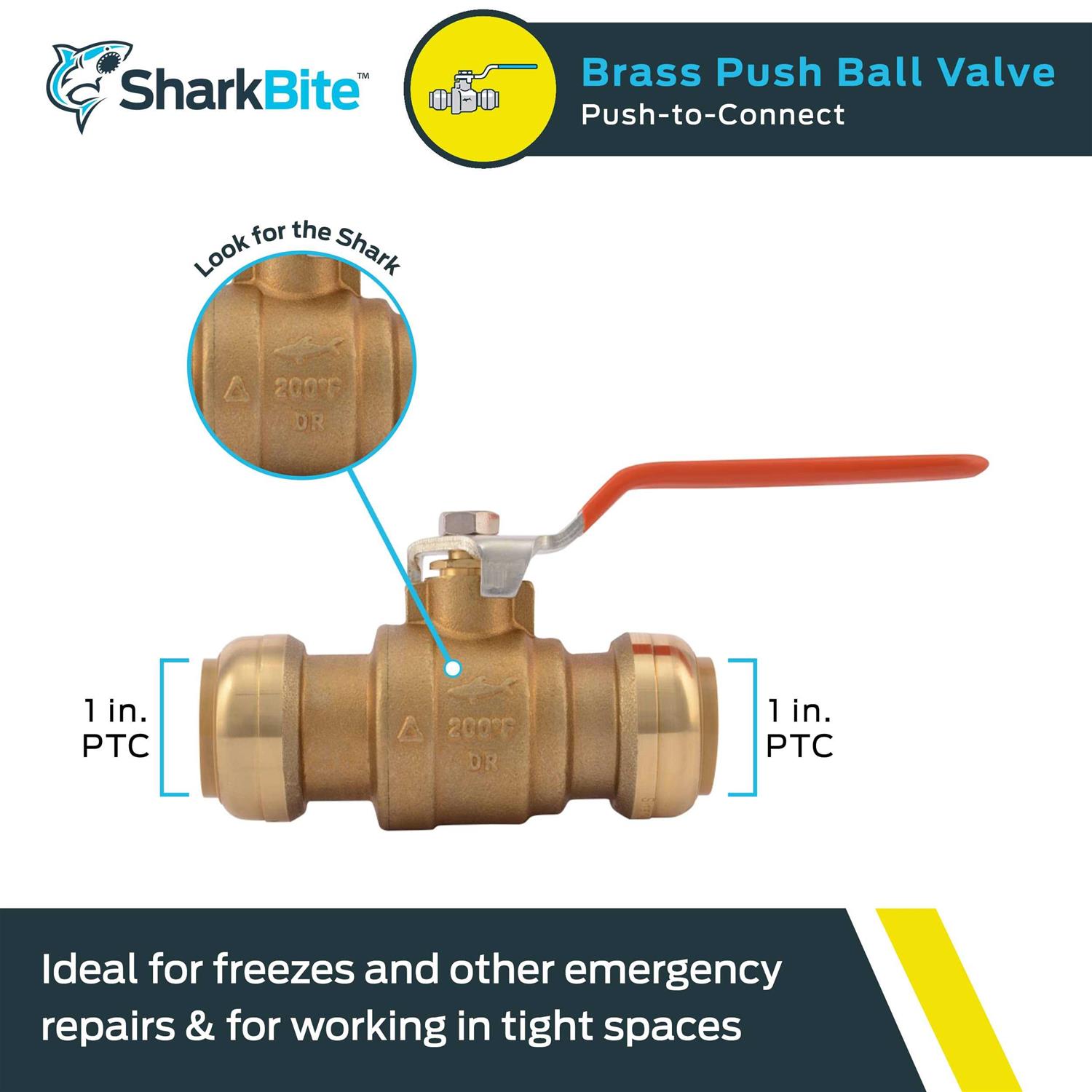CUT. DONE. Used to shut-off water flow for servicing and making repairs. The SharkBite Connection System makes any plumbing project fast and easy thanks to unique push-to-connect technology. When you insert a pipe into a SharkBite quick-connect fitting, the fitting’s stainless-steel teeth bite down and grip the pipe, while its special O-ring compresses to create a watertight seal. No soldering, no clamps, no glue. SharkBite products work with your existing plumbing, are easy to disassemble for changing and reusing fittings, and can be rotated for installation in tight spaces. Whether you need to repair a broken pipe or plumb a whole house, SharkBite provides a push-to-connect solution and leak-free results.