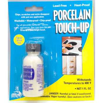 Sheffield 1999 Porcelain Touch-Up Paint Color: Black 1 fl. oz Brush in Cap Chips, scratches and nicks disappear with just one application Washable, Waterproof, Chip Proof For all porcelain surfaces: stoves, sinks, appliances. One coat does the job! Dries to a hard, bright finish. Withstands temperatures to 400 F