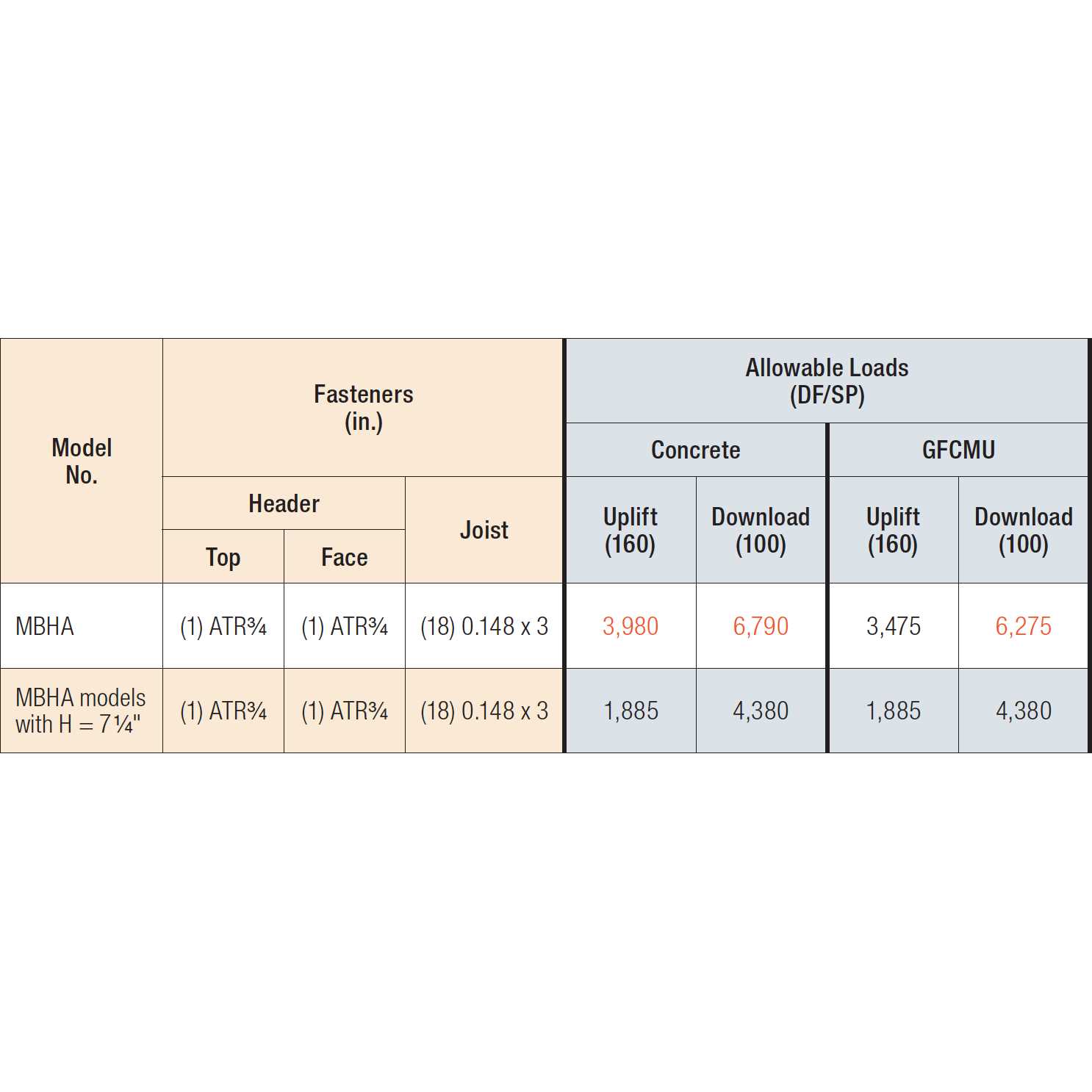The MBHA is a single piece, non-welded connector available for solid sawn, truss and engineered wood products. Material 10 gauge Finish Galvanized Options Seat can be skewed at 45° only. The maximum allowable download is 3,495 lb. and 1,585 lb. uplift for height 7 1/4″. For all other models, use the table listed download and uplift of 2,390 lb. Order MBHAR for skew right and MBHAL for skew left.