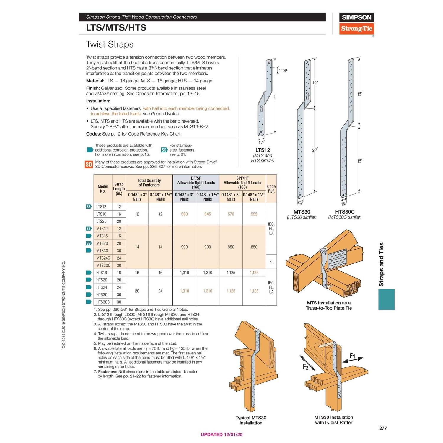 Simpson Strong-Tie MTS twist straps provide a tension connection between two wood members. They resist uplift at the heel of a truss economically. The MTS has a 2″ bend section that eliminates interference at the transition points between the two members. The Strong-Tie MTS12 strap tie features a G90 galvanized finish for added corrosion resistance and requires the use of hot-dip galvanized fasteners which meet the specifications of ASTM A153.
