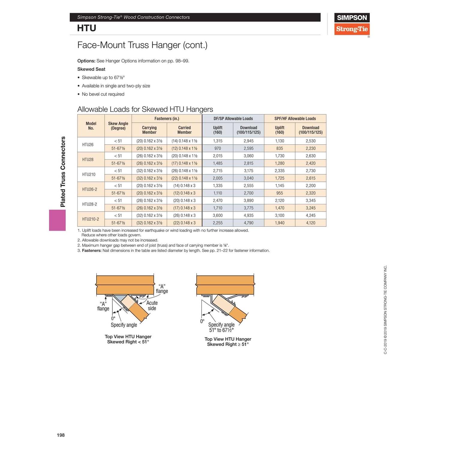 Joist hangers are designed to provide support underneath the joist, rafter or beam to provide a strong a connection. Simpson Strong-Tie offers a diverse line of hangers to handle almost any application with top flange, concealed flange and field skew able and slope able options. The HTU face mount truss hangers have nail patterns designed specifically for shallow heel heights. The full allowable loads (with minimum nailing) apply to heel heights as low as 3-7/8 in. Minimum and maximum nailing options provide solutions for varying heel heights and end conditions.