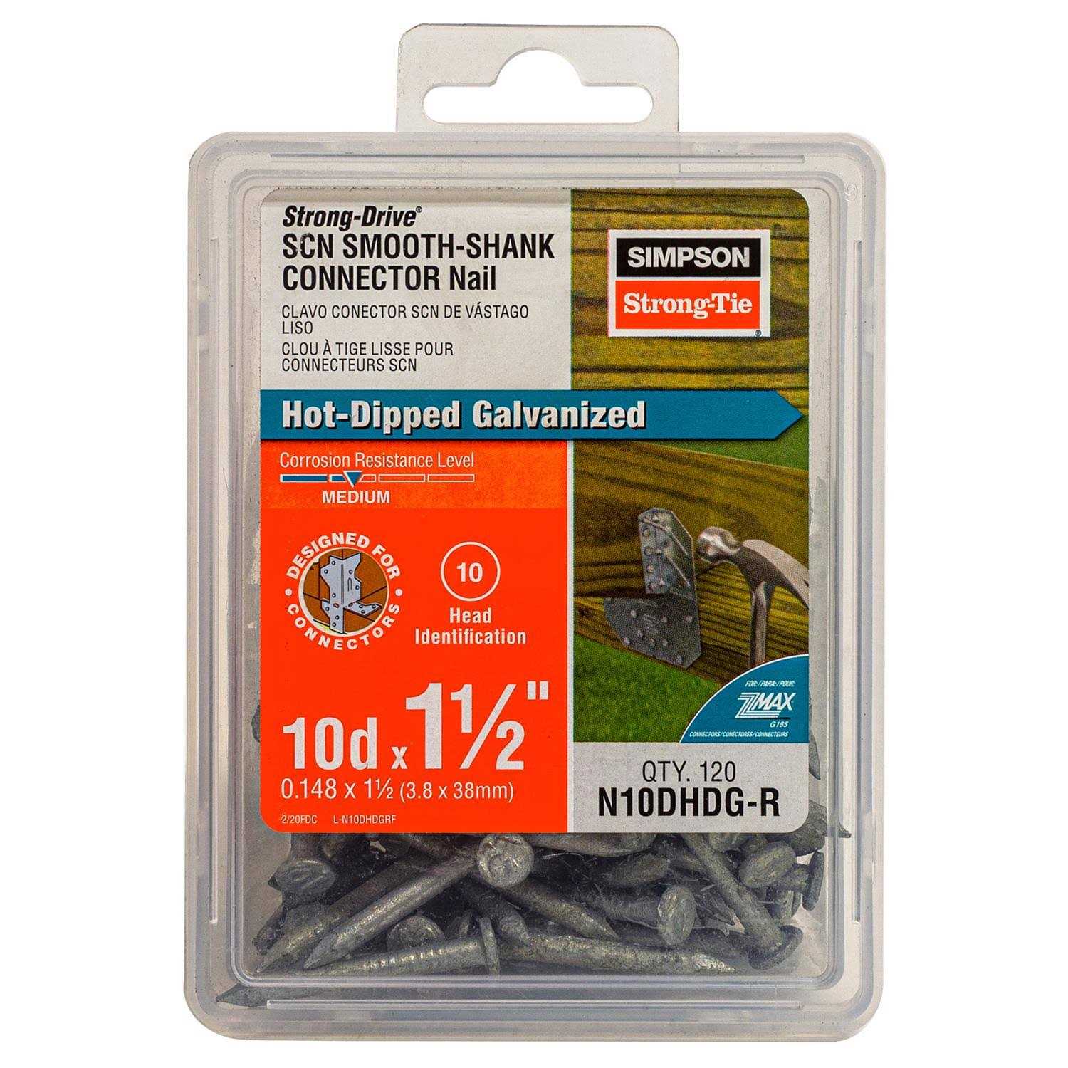 Secure your connectors with the Simpson joist hanger nails. With a 9-gauge, the nails withstand stress. The 1.5 joist hanger nails have a smooth shank that enhances strength and holding power. The hot-dip galvanized nails resist rust and corrosion. They come 120 in a box.