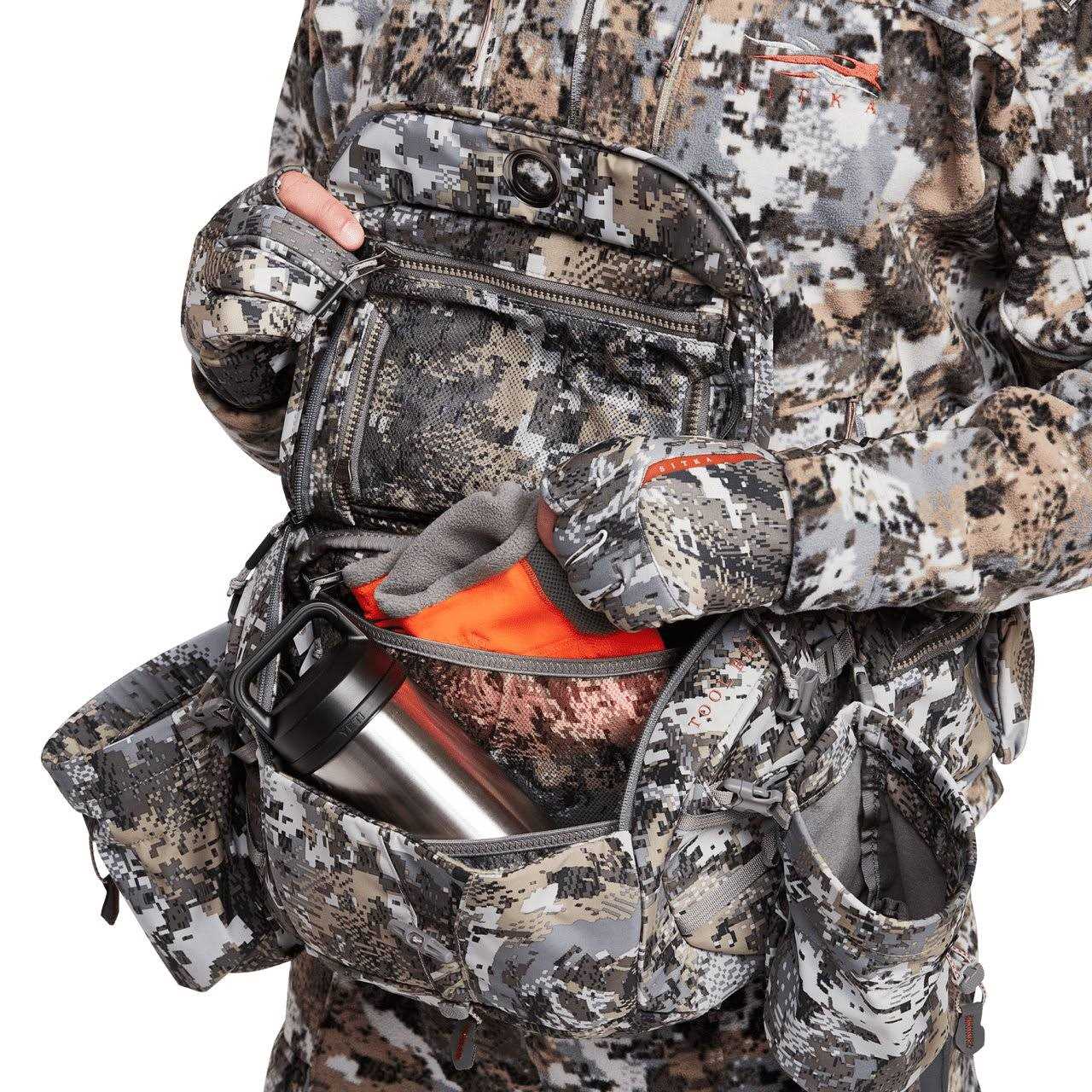 - Low-profile efficiency for the minimalist hunter in a hip pack with a removable Sitka Gear jacket and bib shoulder harness system.