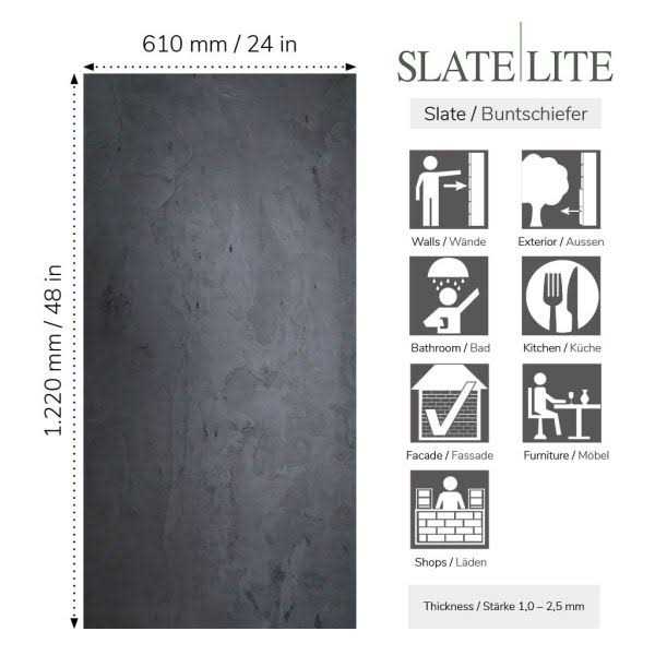 Slate-Lite consists of a layer of natural slate. With 0,1 – 1,4 mm and a backing made of natural polyester. It has glass fiber for strength and dimensional stability. Color: Black.