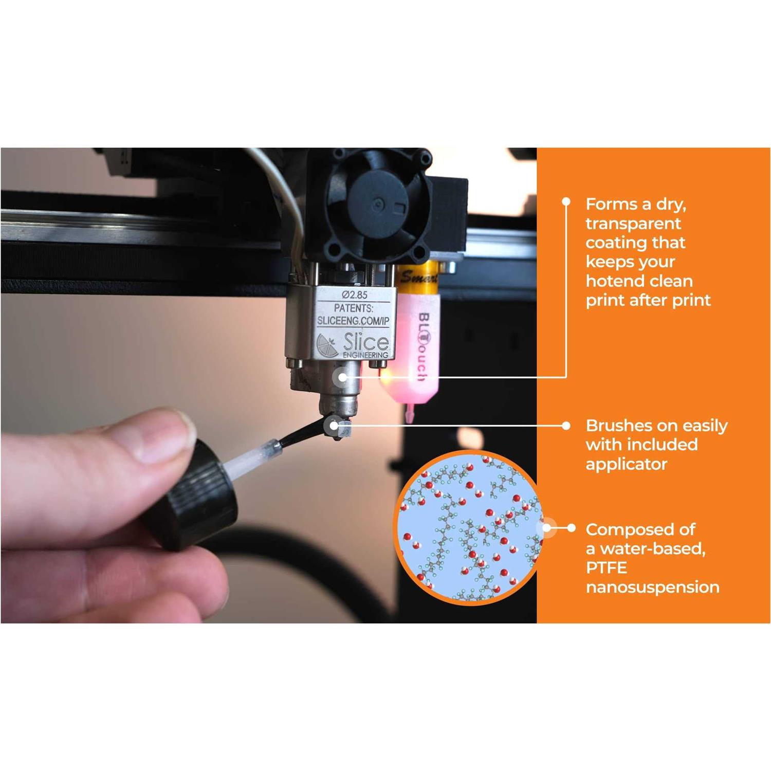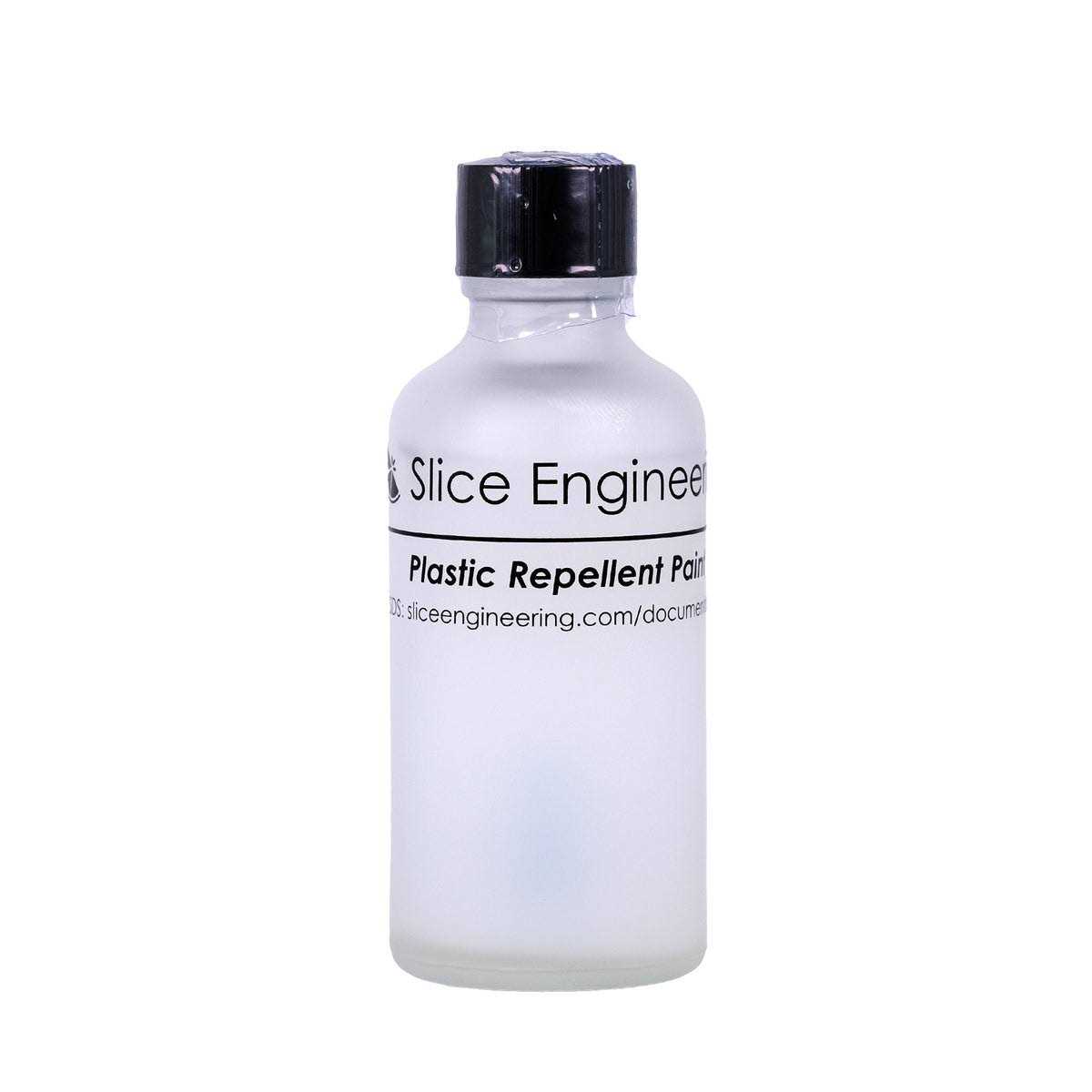 Got a sticky nozzle? Sick of plastic sticking to it all the time? Plastic Repellent Paint by Slice Engineering is the solution for you! Plastic Repellent Paint is a revolutionary, water-based, PTFE nanosuspension that repels plastic from the outside of your nozzle and hot block. Which is awesome, because it prevents that annoying plastic buildup that causes print failures! Plastic Repellent Paint can be applied in seconds using the vial’s brush top, forming a dry, transparent coating that endures print temperatures up to 290°C. Keep your nozzle clean with some high-tech space magic, and worry no more. Water-based PTFE nanosuspension Repels plastic from the outside of your nozzle and hot block Applies quickly and uniformly with the vial’s brush top Bonds with clean metal surfaces upon first heating to form a dry, transparent coating Endures printing temperatures up to 290°C Each vial contains 3 cc of Plastic Repellent Paint The Safety Data Sheet for Plastic Repellent Paint can be found on our Documentation page.