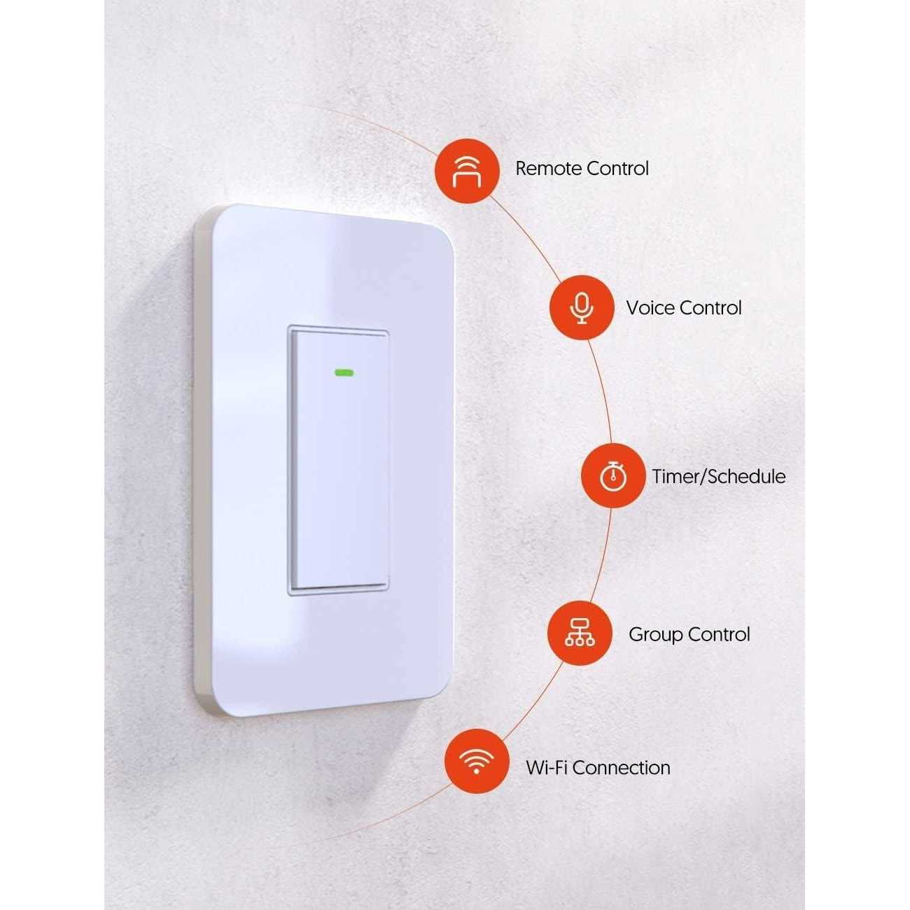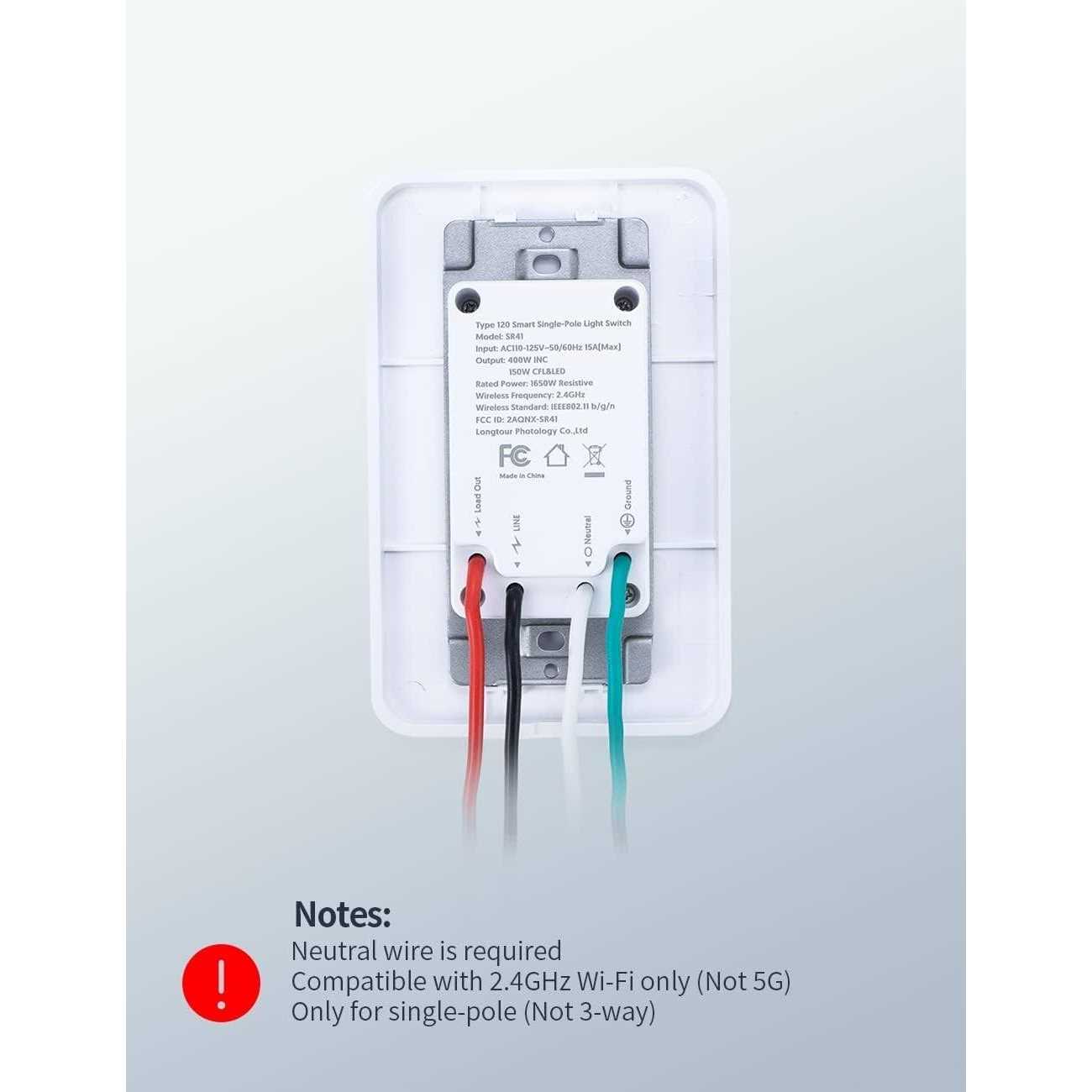 【Set up Easily】 No difficult installation manual and configuration, connect a device to the smart light switch, and wireless control your device using a tablet or phone. Smart switches make the most sense when you have a room, or rooms, with many ceiling lights.NOTE: NEUTRAL WIRE IS NEEDED. Smart Light Switch can only be paired on 2.4 GHz Wi-Fi. 【Remote Control】Control your light anytime and anywhere via smartphone using the FREE APP Smart Life app (Compatible Android & iOS). Remote control saves your time and energy when you forget to turn off the home appliances. 【Voice Control】Compatible with Amazon Alexa, Google home assistant and Google Nest Hub, control your light with the smart light switch by simply giving voice commands to Amazon Alexa or Google Assistant. No Hub Required, the smart light switch works with any Wi-Fi router without the need for a separate hub or paid subscription service. 【Schedule & Timer】Get ready to have a smart home and create customized schedule to automatically turn on and off your light. For example, start sleep schedule or routine to get baby sleep better. 【Reassuring Quality】The Smart Light Switch features a sleek new design that is FCC approved product. – 1、Wi-Fi Only support a 2.4GHz network[802.11b/g/n] – 2、Neutral wire Required. – 3、Basic electrical wiring knowledge or experience required, or please consult a professional electrician. – 4、Never connect the neutral wire to any switch wires. – 5、ON/OFF Button also can be used as reset button,long press to reset your smart switch to factory defaults.Only do this if you are sure you want to erase all your settings. – br – 【Specifications】 – Type:Type 120 Smart Single-Pole Light Switch – Model:SR41 – Power supply Mode:Neutral+Live Wire – Input:AC110-125V~50/60Hz – Output:400W Max.for INC Bulb 150W Max.for CFL&LED Bulb – Wireless Frequency:2.4GHZ – Wireless Standard:IEE802.11b/g/n – br – Performance parameters: Intelligent wall switch. – Functional requirements: WIFI intelligent remote control. – Packing list: manual, switch, accessory kit. /p