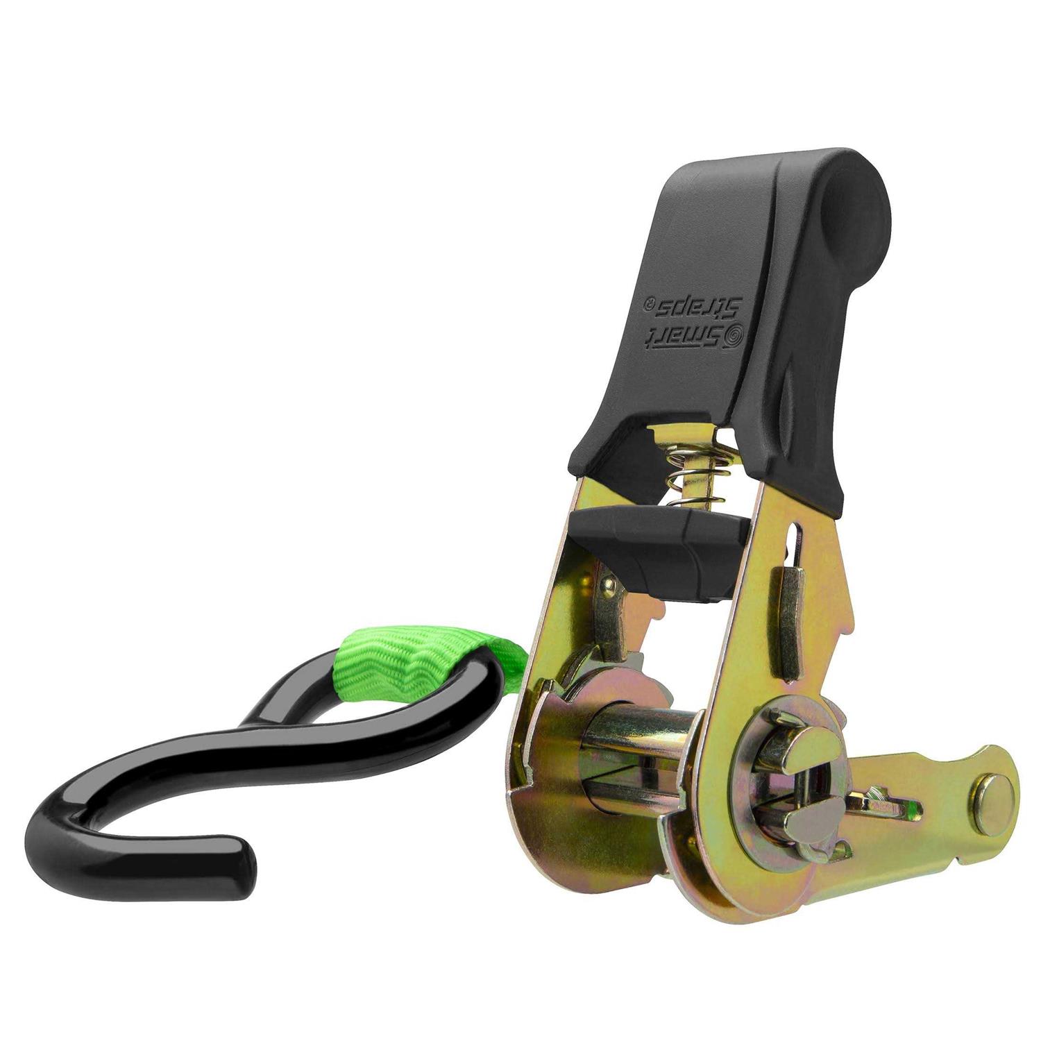 The SmartStraps 14′ 1,500 lbs Padded Ratchet features four green standard duty capacity ratchet tie downs to withstand tough outdoor conditions. These ratchets come with padded handles for maximum leverage and soft-tie loops that secure cargo without scratching or damaging your chrome or paint. These strong ratchet tie downs have a breaking strength of 1,500 lbs.