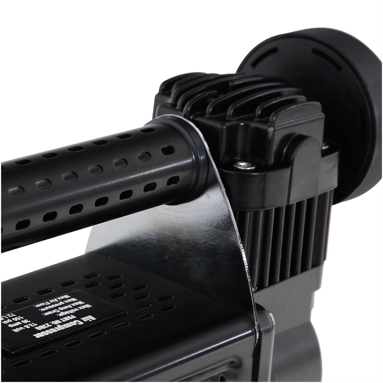 Provide yourself with compressed air wherever you need it when you use the Smittybilt High Performance Air Compressor. This easy to use portable air compressor allows you to fill up your tire or use it for other compressed air needs no matter where you are. The unit features an oil-less direct drive motor with 1/3 horsepower and a 30 amp inline fuse. Includes an easy use brass inflator top with twist screw-on feature.The Smittybilt High Performance Air Compressor includes an easy to read integrated 150 PSI pressure gauge with anti-vibration rubber feet and a 16-foot coil hose with quick release. The air compressor can be hard-wired and permanently mounted for more stability and power. The air compressor also includes a built-on cleanable air filter and an auto thermal cutoff switch. This compressor can generate up to 72 liters per minute.