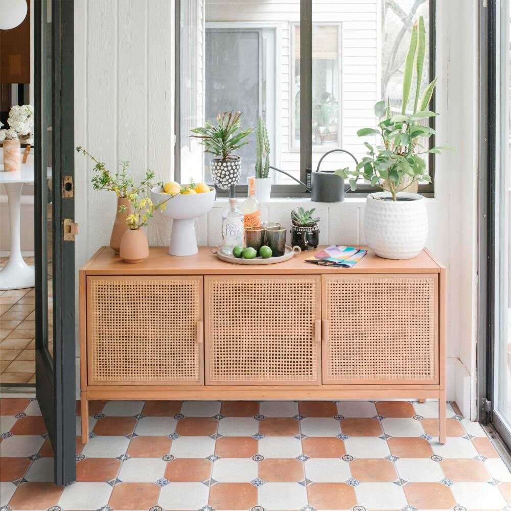 Maises jet Mix ceramic floor and wall tile features a Crackle glaze for a unique finish. The simple alternating brick and Beige colored Squares are accented with smaller design Squares in the corners featuring blue, Green and orange all assembled on one large sheet. These semi-vitreous high sheen tiles are great for use in a kitchen or powder room.