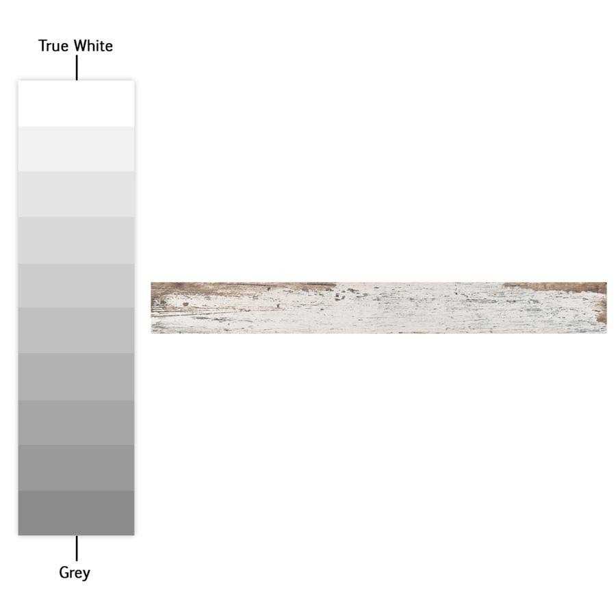 Porcelain Floor and Wall Tile is a breathtaking addition to our collection of wood-look tiles. Crafted in Spain, the white glaze features a meticulously detailed grain accented in grey. To add further contrast and depth, this tile has subtle bumps and grooves that echo the texture of real wood. The finishing touch on this small plank is the imitations of scuffs and spots, which gives this tile an antiquated appearance reminiscent of distressed painted wood. This extruded porcelain tile has high variation for a one-of-a-kind look that can only be achieved through the partially handmade process. This tile offers endless design possibilities when paired with other products in the Retro series. This impervious, matte tile will look great in all indoor and outdoor locations, including walls, floors and patios.