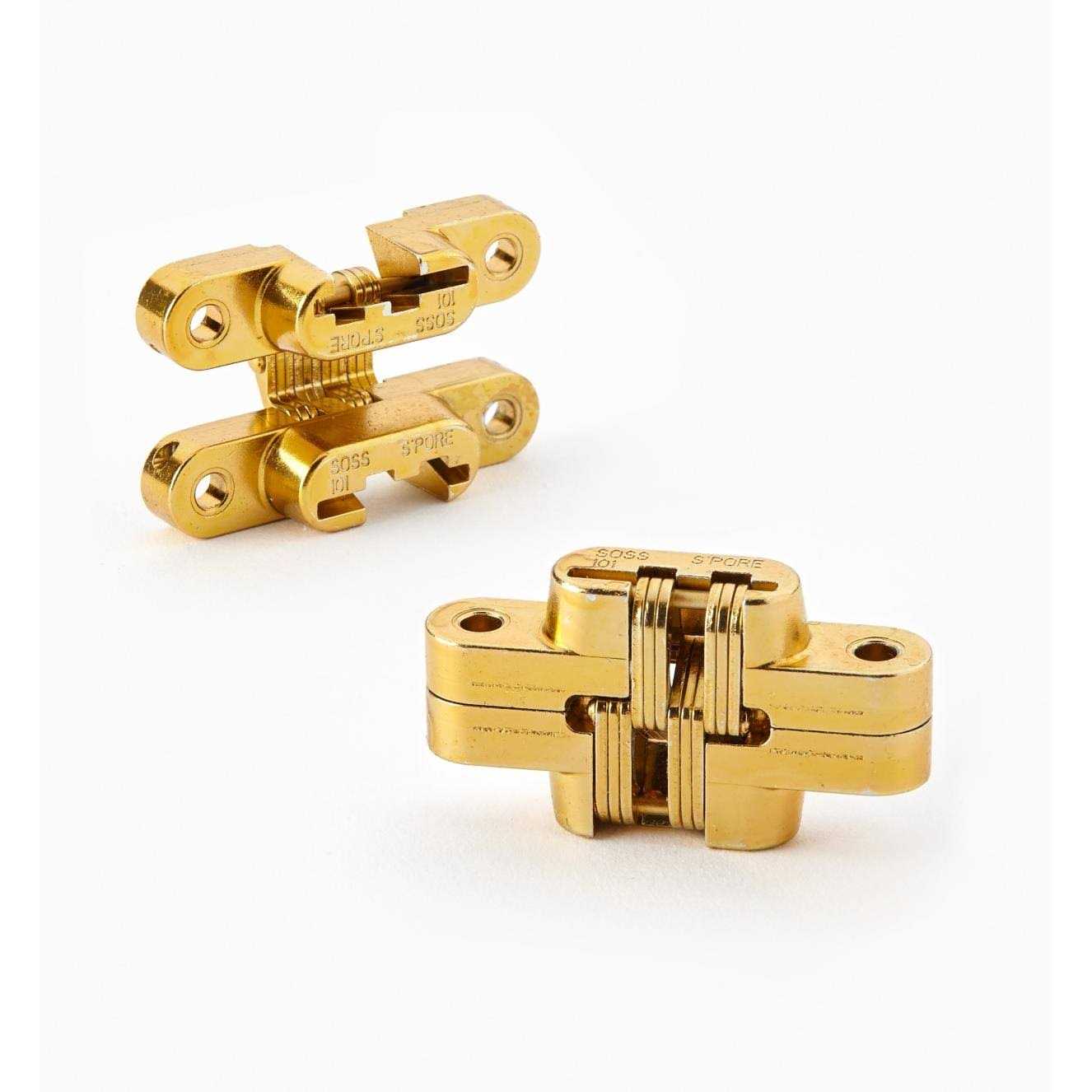 These versatile hidden hinges offer exceptional strength, security and smooth operation. Regular hinges support weight on a single knuckle located outside the jamb, but these hinges place the weight on multiple moving pivot points within the hinge body so they can bear heavy loads. They seat flush in a deep mortise to resist sagging, remaining inconspicuous and tamper-resistant when closed. The interlinked laminated steel plates move smoothly and silently, opening 180°. Easily installed with a drill in wooden doors and frames (see note below). Minimum material thickness of 1/2″ required. Cast in heavy-duty zamak, with a satin brass, satin chrome or black finish, these hinges are designed to last a lifetime. Instructions, screws and drilling template included. Note: You can use a drill to cut mortises for SOSS hinges; however, using a plunge router with spiral upcut bits gives better results since they cut cleanly and clear material efficiently. You can easily make a router-mortising jig using the included drilling template. To determine the size and number of hinges needed per door, consult the Specifications tab.