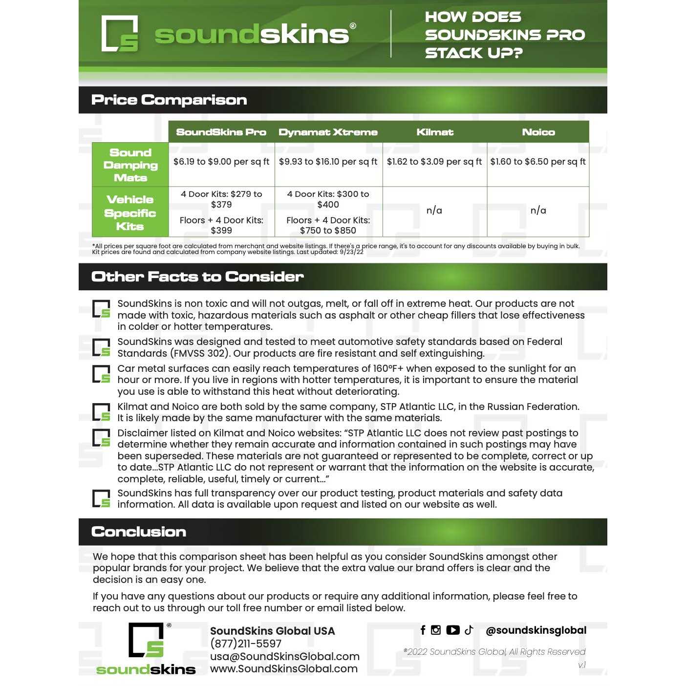 Insulation by Soundskins. Details:Improve Sound, Reduce Noise SoundSkins Pro is the elite in sound dampening for your vehicle, designed to improve your cars stereo performance and reduce outside road noise in a single material. SoundSkins Pro is a combination of 3 layers, acoustic foam, foil & rubber butyl (the black sticky stuff). This custom blend of materials allows you to layer any panels in your vehicle to reducing vibrations, loss of sound and improve heat rejection. Large single sheets make it easy to apply and cut to size for any application. The rubber butyl has a high adhesive level meaning it will never never fall off once applied correctly. The foam and butyl are both waterproof and heat proof designed to stand the test of time.