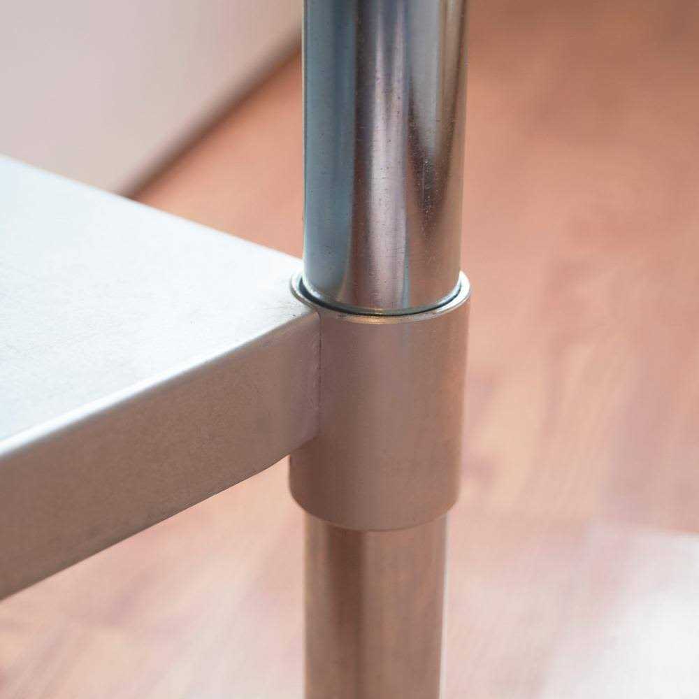 - Adjustable height galvanized metal shelf for storing appliances and supplies measures 17in D x 65in W.