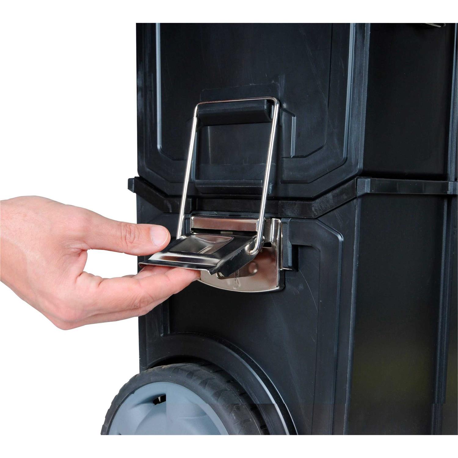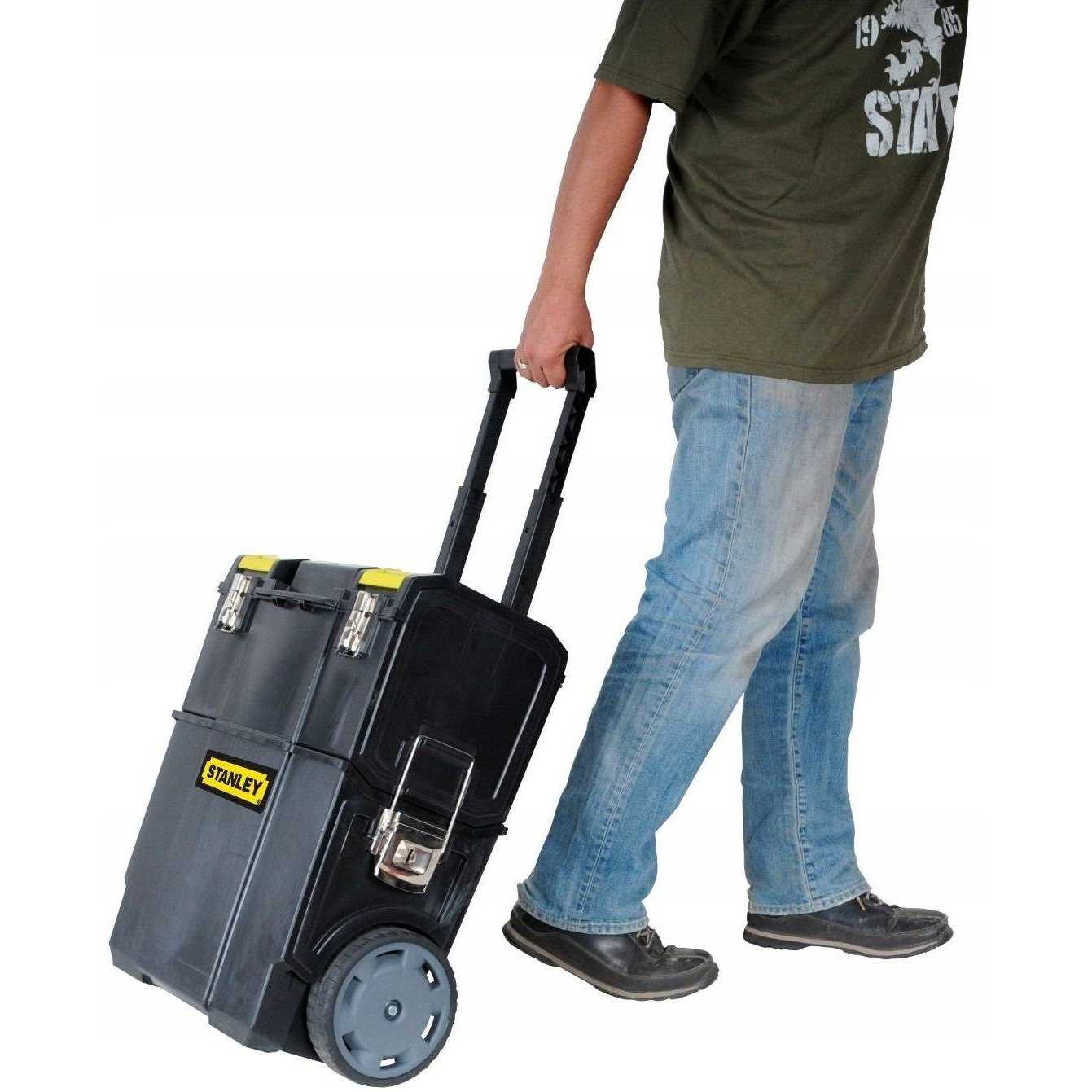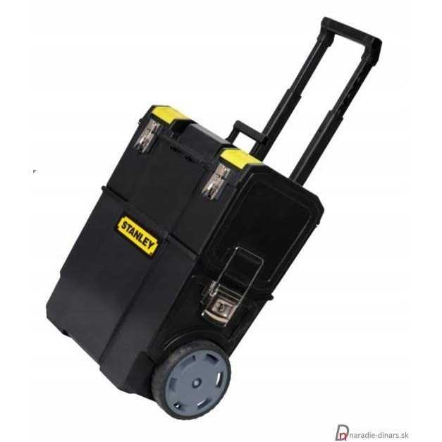 The Stanley 1-70-327 2-in-1 Mobile Work Centre is a detachable top toolbox unit with small parts storage on top. The bottom bin has large 7 inch wheels and the pull handle on top allows for easy convenient manoeuvrability. Large metal latches connecting the units provide extra security whilst in transport. The mobile work centre has a huge storage volume for power tools hand tools small parts and accessories. Dimensions: 475 x 284 x 570mm. The Stanley 1-70-327 2-in-1 Mobile Work Centre is a detachable top toolbox unit with small parts storage on top. The bottom bin has large 7 inch wheels and the pull handle on top allows for easy convenient manoeuvrability. Large metal latches connecting the units provide extra security whilst in transport. The mobile work centre has a huge storage volume for power tools hand tools small parts and accessories. Dimensions: 475 x 284 x 570mm.