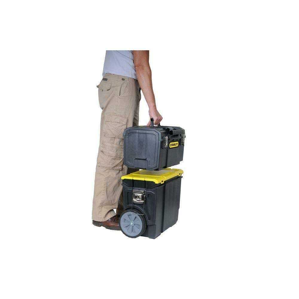 The Stanley 3 In 1 Rolling Workshop is the ultimate in portable storage and organization. This impressively durable tote features a large storage bin, middle organizer, and a roomy tool box on the top. The large wheels make it easy to roll around for a completely mobile way to bring your tools and accessories to any job site. Dimensions: 11W x 24.8D x 18.5H in. Innovative design with robust structure and large volume. Design includes large storage bin, middle organizer and top tool box. Metal front and side latches. Large wheels for great mobility.