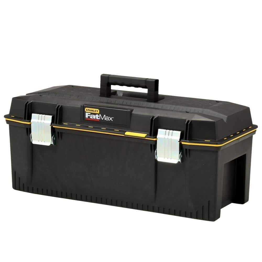 Keep your large tools and other essential work items in one handy spot with this Stanley FatMax 28 inch Toolbox. It is manufactured with structural foam and has a water seal to protect the contents from moisture. The heavy-duty frame is tough and durable for years of rugged use. Anti-rust latches with padlock eyes are integrated into this sturdy storage chest. The Stanley FatMax toolbox is designed to carry a lot of weight. It comes with enough room to keep wrenches screwdrivers hammers ratchets and socket sets. Integrated V-grooves on the top lid provide a workbench that is suitable for securing pipes and lumber when cutting. The portable tote tray is designed to hold smaller tools and other items such as bolts and screws. It lifts out easily to allow access to the larger tools stored underneath.